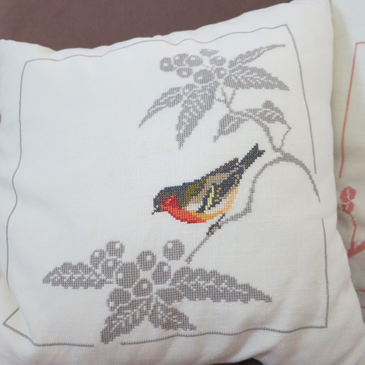 Les trois coussins aux oiseaux ont donc gagné le prix de « l’ouvrage le plus long à terminer »…! Mais cela en valait vraiment le coup, car les motifs continuent à m’épater par le choix des couleurs et la finesse des contours.