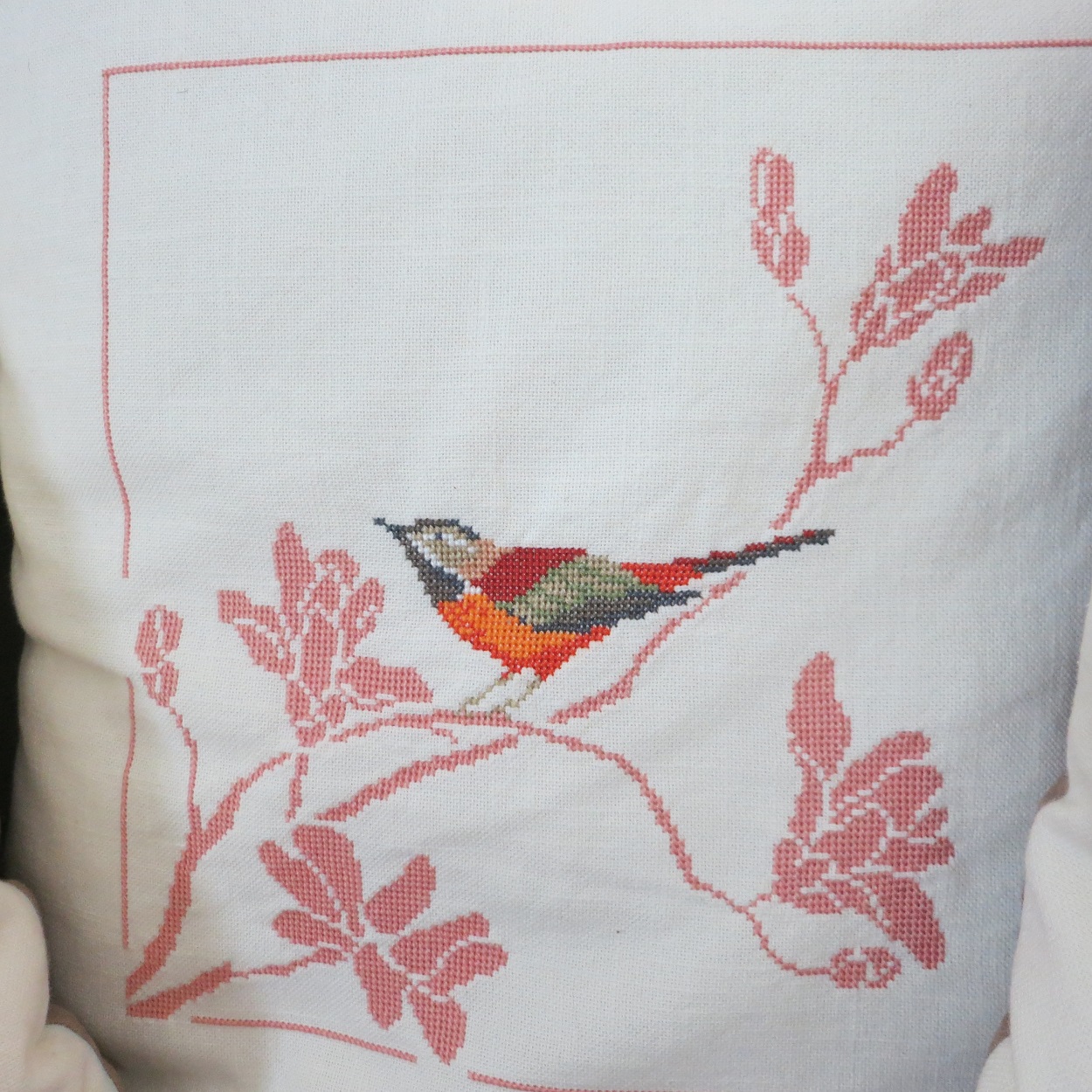 En 2008, alors que je m’étais remise à la broderie au point de croix (après près de 15 ans de pause…), j’ai acheté mon tout premier magazine « Point de croix » (numéro mars-avril 2008). Les motifs magnifiques de ce numéro m’ont définitivement encouragée à me remettre à cette technique de broderie. J’ai été tout de suite charmée par les trois motifs d’oiseau brodés sur des coussins en pages 70 et 71 de ce magazine. J’ai donc acheté un beau tissu de coton aspect lin, les échevettes de couleur DMC nécessaires, et même les fermetures éclair des coussins! Mais le destin des pauvres oiseaux était loin d’être scellé: en effet, après avoir quasiment achevé un des oiseaux et avoir commencé le deuxième, l’ouvrage est resté pendant près de 7 ans (!) au fond d’un tiroir, en attente de jours meilleurs. Ce n’est qu’en 2015 que je le ressors et que je le termine… enfin!