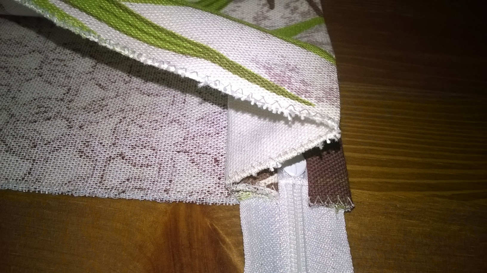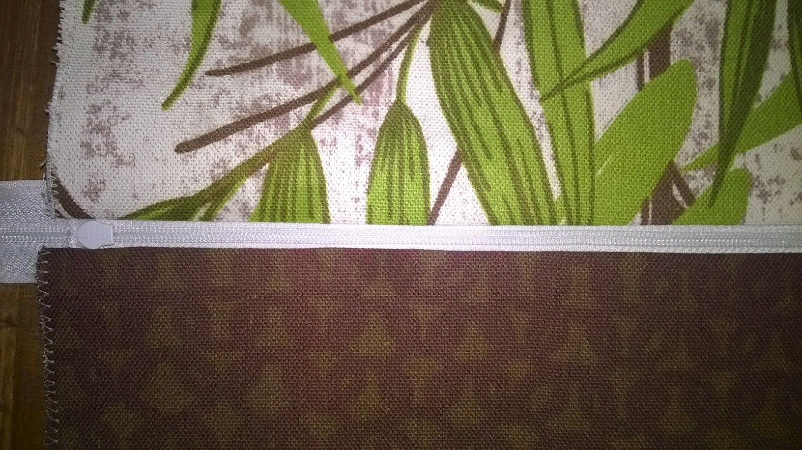 Sur un des petits côtés, coudre un côté de la fermeture éclair, endroit sur endroit, sur le bord du tissu. Cela donne ceci: