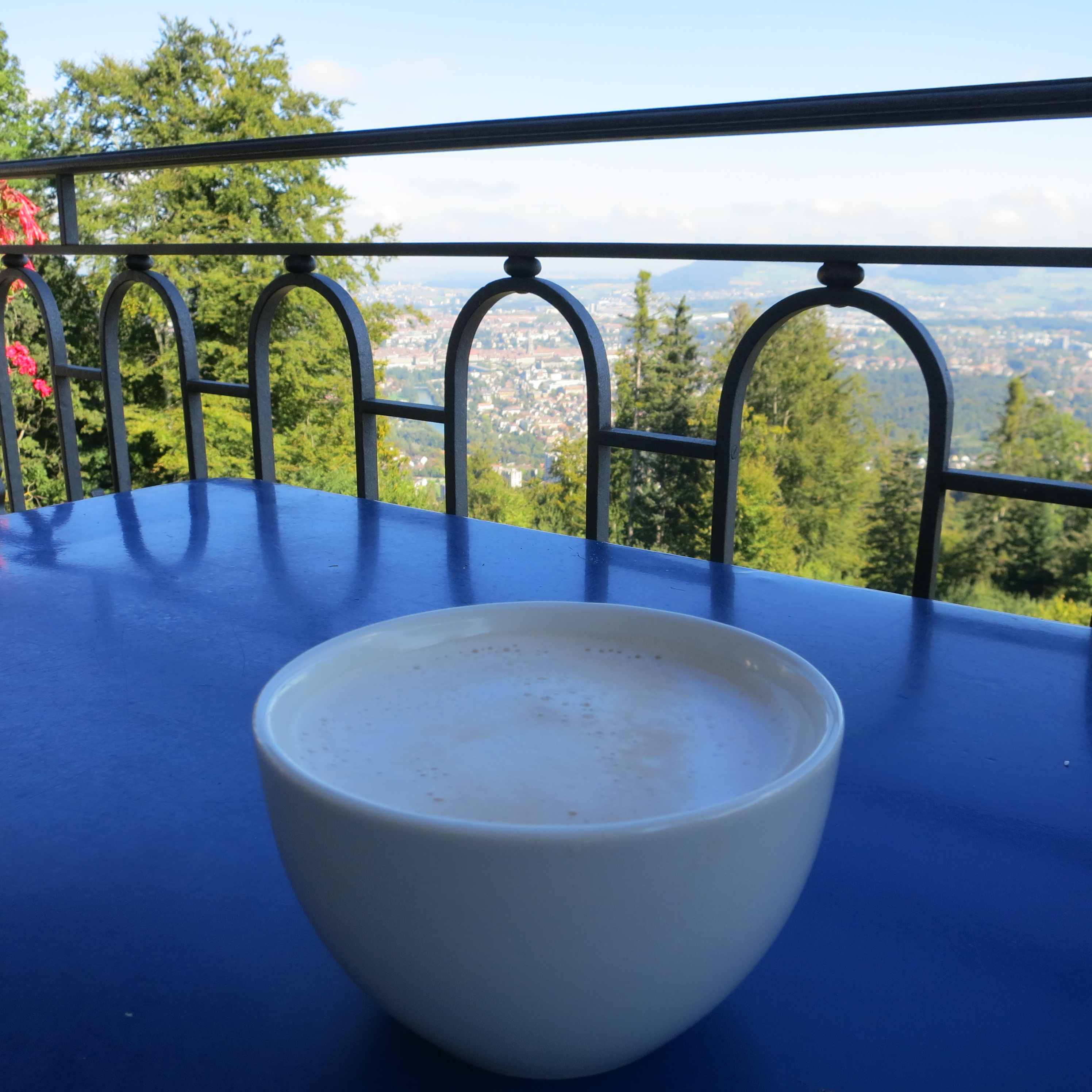 Pendant que Héctor dévale la pente sur des cailloux et des racines, moi je m’installe tranquillement à la terrasse du « Tapis rouge », le restaurant self-service avec vue magnifique sur la ville de Berne. Je bois « eine Schale », autrement dit « un bol », ce qui, à Berne, n’est autre qu’un café au lait. Le mot « bol » a été pris très littéralement, comme vous pouvez le constater sur cette photo.