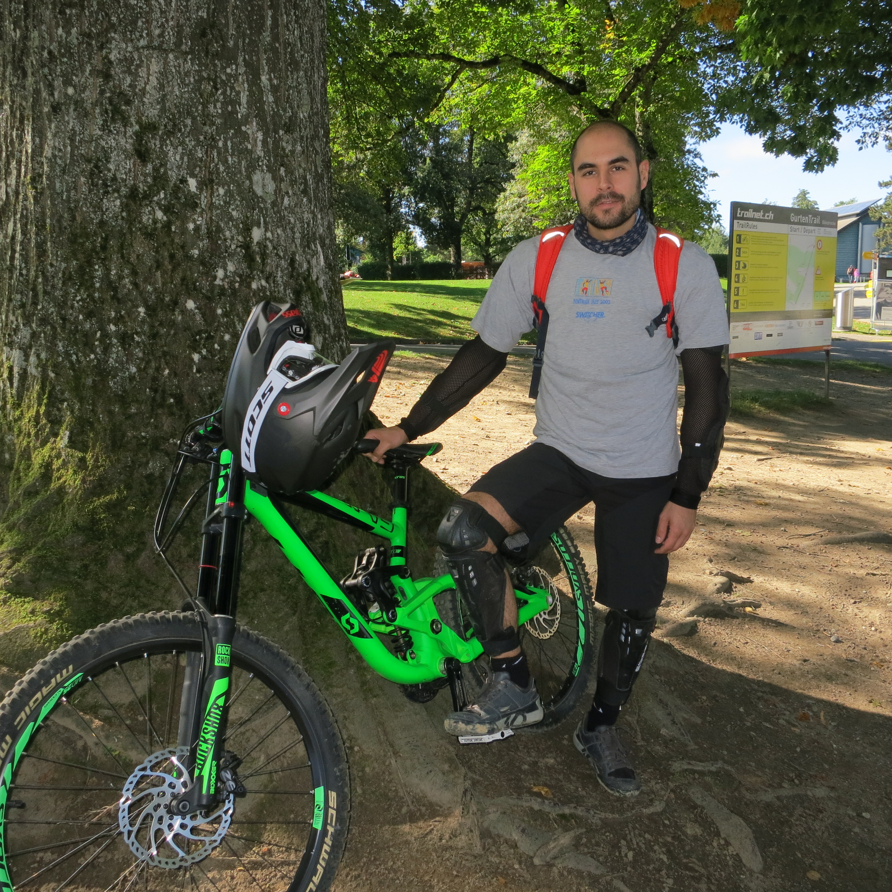 Aujourd’hui, Héctor a tout particulièrement l’intention de tester la piste Downhill du Gurten. Pour ma part, le programme est plutôt: café, randonnée, lecture sur un banc. C’est parti!