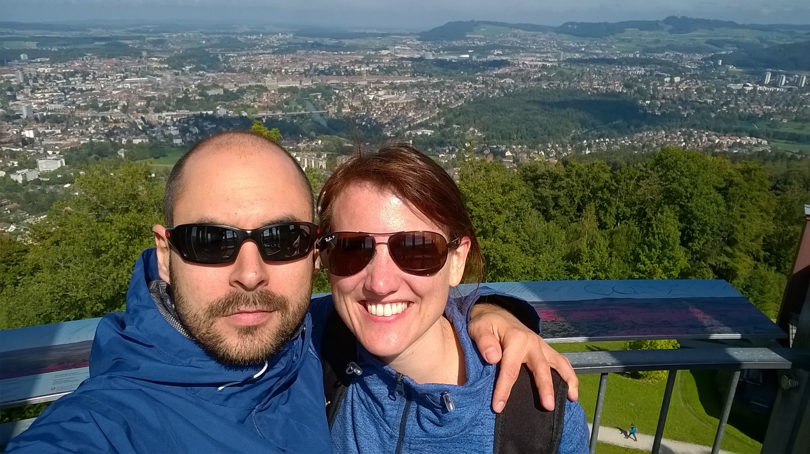 Depuis la tour, la vue à 360°C sur le « Mittelland » est imprenable. Le regard embrasse le paysage depuis les Préalpes fribourgeoises jusqu’au Jura, puis la ville de Berne, le Palais fédéral, les méandres de l’Aar… Au loin on aperçoit même le miroitement du lac de Neuchâtel, mais malheureusement le ciel est un peu brumeux en direction du Jura.