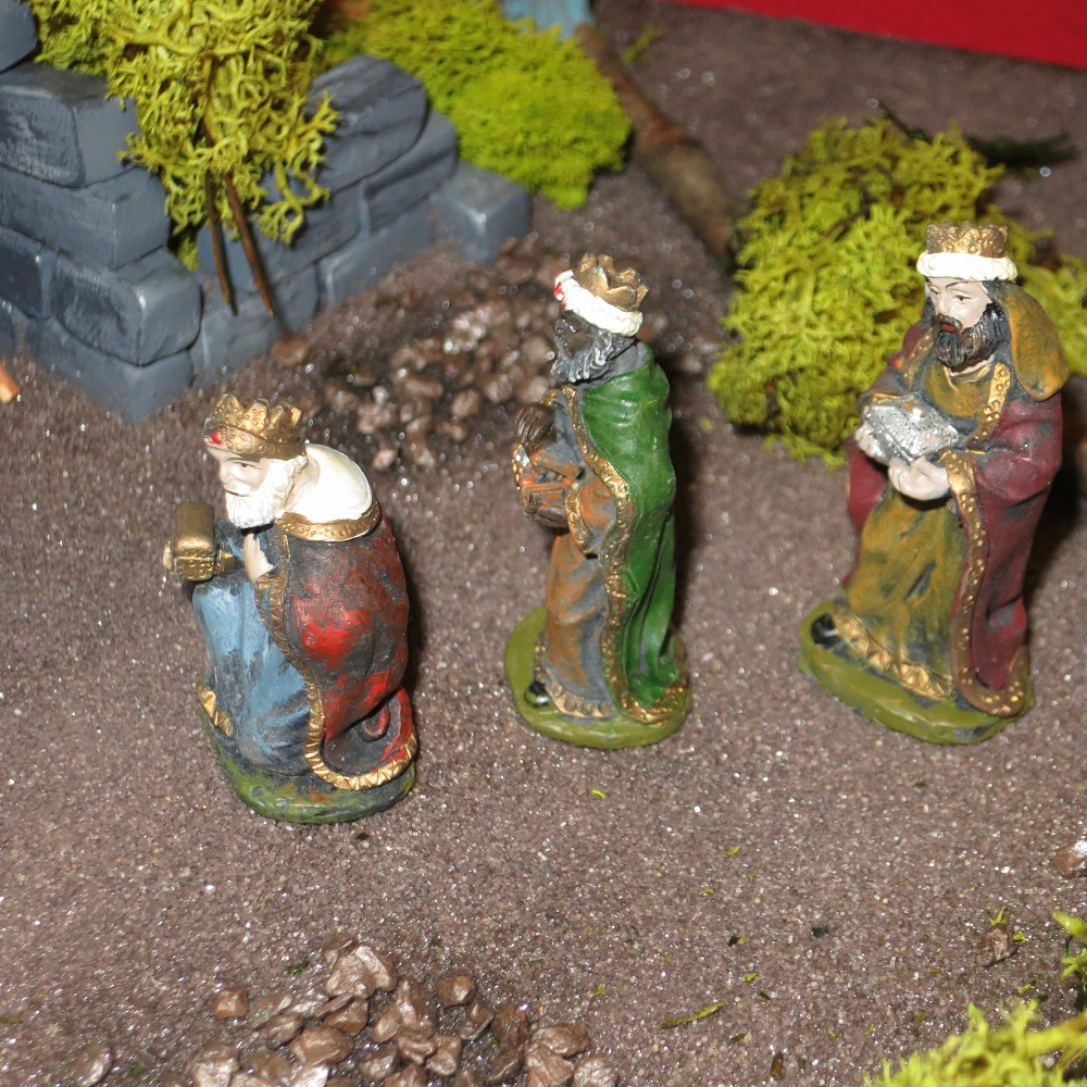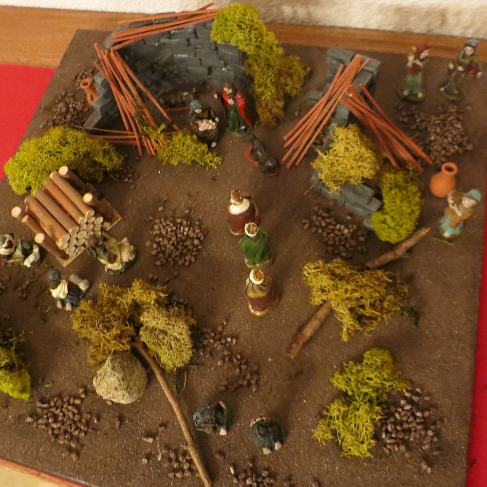 Le reste, ce sont des pièces mobiles que j’ajoute pour décorer ma crèche: des baguettes en bois, des branches, des cailloux, de la mousse… et enfin les figurines (pas besoin de chercher, je n’ai pas de cagón…). Puisque ces éléments ne sont pas fixés sur la planche, je peux réinventer une nouvelle crèche chaque année, au gré de mes envies!
