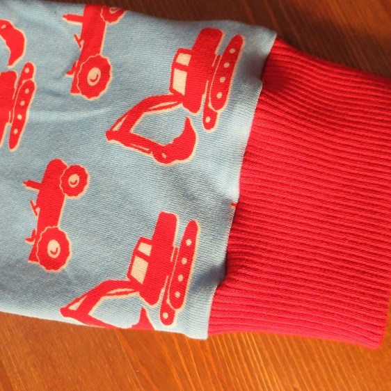 Alors vous pensez bien que je n’ai pas pu résister à l’appel de ce jersey bleu ciel aux motifs de machines de chantier, découvert dans un magasin de tissus à Berne. Le cadeau d’anniversaire pour Alicia était tout trouvé!