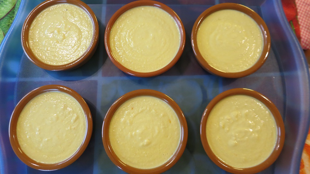 Pour la crème catalane, j’ai utilisé une recette du livre de Linda Tubby, Cuisine d’Espagne. Un excellent ouvrage que je peux recommander à toutes celles et ceux qui cherchent une référence authentique pour la cuisine espagnole. L’auteure, bien qu’elle ne soit pas espagnole elle-même, fait vraiment honneur aux ingrédients et aux saveurs typiquement ibériques. En plus les recettes sont accessibles, tant au niveau des ingrédients qu’au niveau de la complication. Bon, la fameuse crème catalane n’était pas toute simple, puisqu’il fallait cuire la crème d’abord puis la laisser reposer une demi-heure avant de la verser dans les pots. Mais le résultat en valait la peine. Après refroidissement complet des crèmes, elles ont évidemment été saupoudrées de sucre et « brûlées »: malheureusement, je n’ai pas pensé à prendre de photos après cette étape cruciale. Nous étions visiblement trop occupés à déguster le dessert!