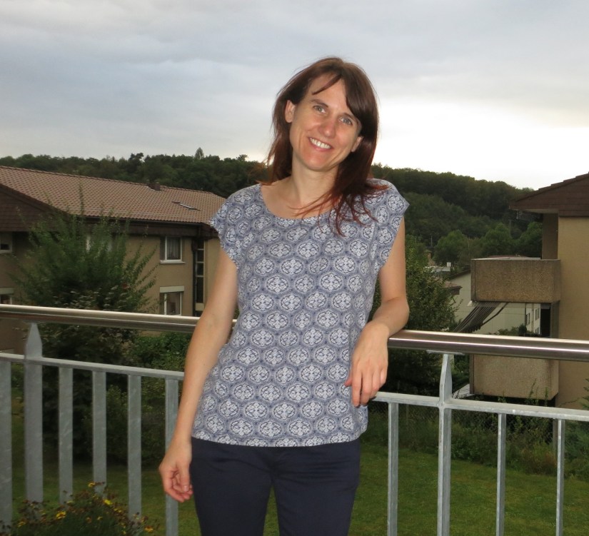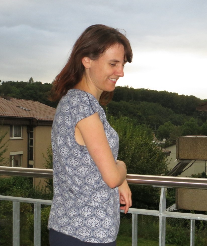 Pour le tissu, je me décide pour un joli jersey de viscose tout doux et tout fin, acheté dans le magasin de tissus à deux pas de chez moi (eh oui, il y a un magasin de tissus à Ostermundigen, même s’il n’arrive pas aux chevilles de celui de Bulle…). Le motif ethnique du tissu m’inspire un biais en coton bleu foncé ton sur ton pour ma décoration sur les épaules.