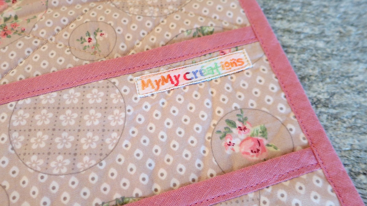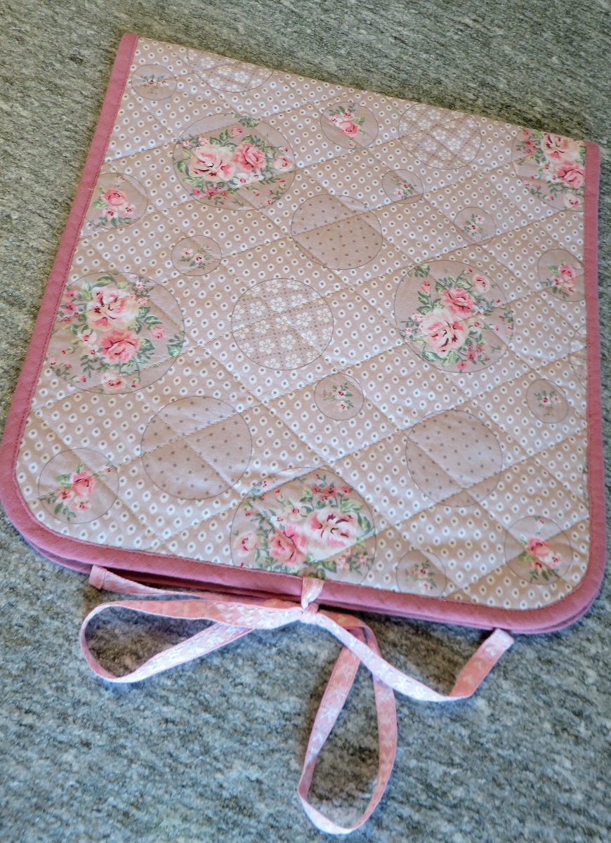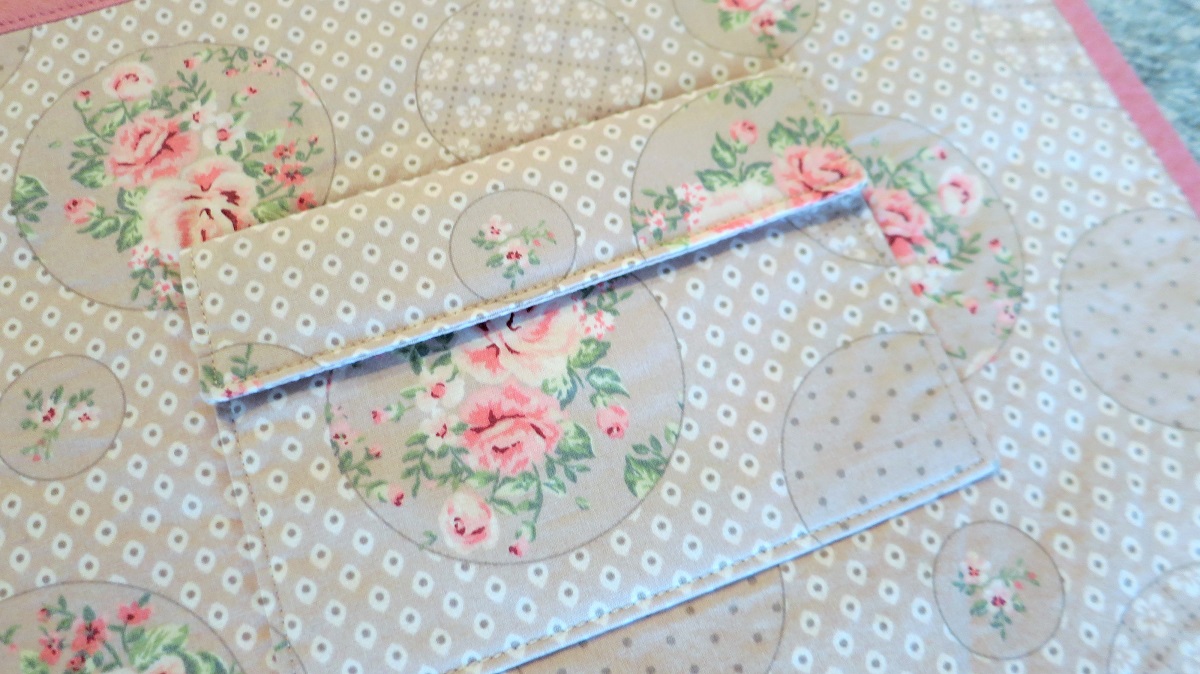 Pour cette création, j’ai choisi un coton de couleurs pastel, imprimé de douces roses et de motifs géométriques. Le modèle proposé par Burda a subi de nombreuses modifications. J’ai décidé d’abord d’orner la partie extérieure d’une surpiqûre en damier rappelant le patchwork. A l’intérieur j’ai ajouté une troisième poche plus petite, et j’ai même confectionné une poche à rabat avec une fermeture velcro afin de ranger de petits objets, par exemple des bijoux. L’ouvrage est bordé d’un biais rose tout autour. La pochette se ferme à l’aide d’un ruban rose à coeurs.