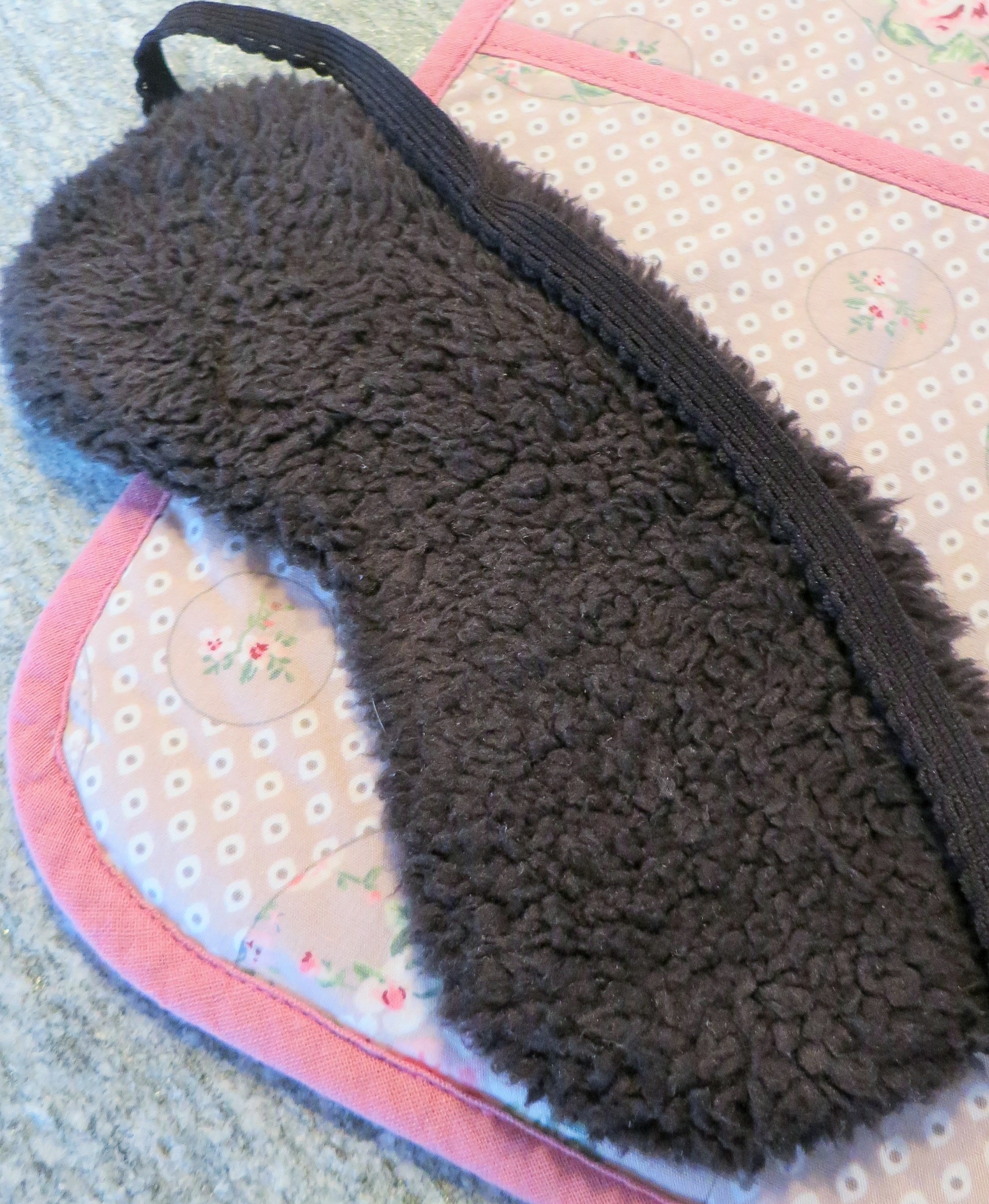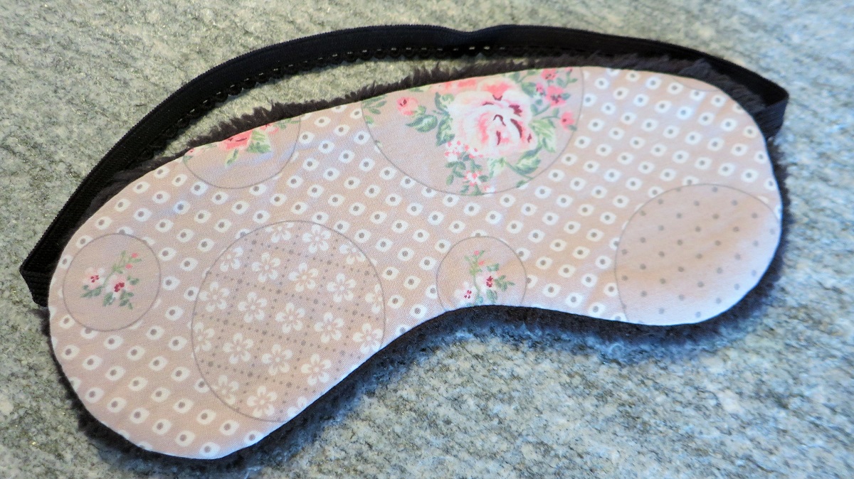Afin que le masque de nuit soit agréable à porter, j’ai opté pour un tissu noir en fourrure synthétique toute douce. Pour l’extérieur j’ai utilisé le même tissu à fleurs que pour la pochette. Une vlieseline lui donne plus de stabilité.