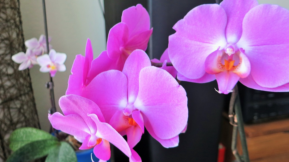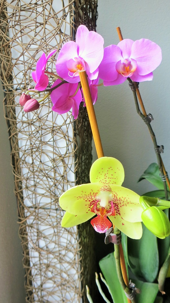 Les orchidées jaune et rose foncé en sont déjà à leur deuxième floraison de suite… En effet, elles ont refleuri les deux sur la même hampe florale, du jamais vu dans mon appartement!