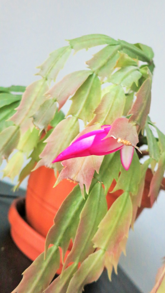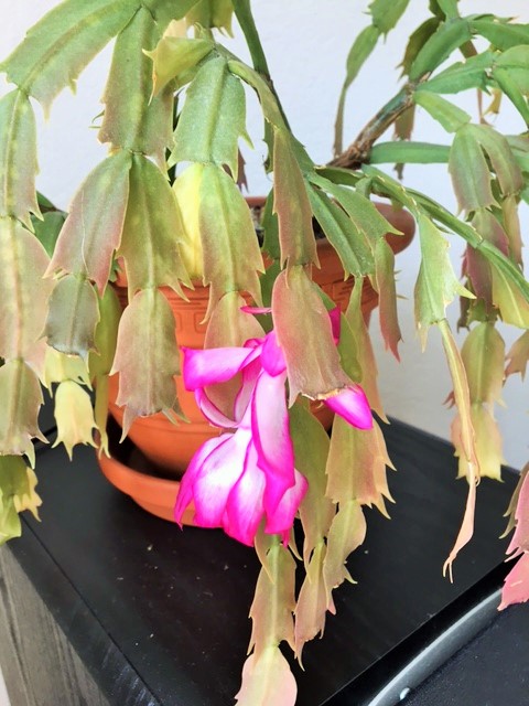 De l’endroit où j’avais dû arracher une tige dont la racine commençait à pourrir, je découvris à ma plus grande surprise une minuscule tige toute verte et fraîche en train de sortir de terre!! Un miracle! Et en examinant la plante de plus près, je n’en crus pas mes yeux: un bouton de fleur – un seul! – se cachait timidement sous une feuille. Quel coquin!! Quelques jours plus tard, la fleur était ouverte. Pas d’autre bouton en vue pour l’instant, mais je ne perds pas espoir. Tel un phénix, mon cactus de Noël est en train de renaître de ses cendres…!
