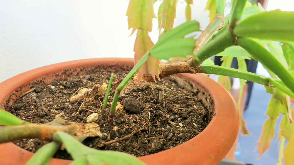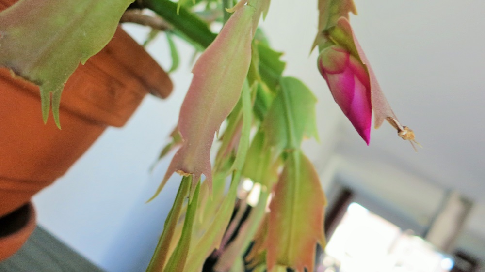 Une autre plante de mon appartement m’a fait d’abord une grande frayeur, puis une grande joie. Le cactus de Noël que j’ai hérité de ma grand-maman paternelle – une plante fidèle qui fleurissait chaque année – avait commencé à faiblir ces dernières années. Les feuilles ont commencé à rougir et les fleurs arrivaient de plus en plus tard… Du mois de novembre on était passé à une floraison au mois de février. Puis, les deux Noëls passés il avait carrément cessé de fleurir. Inquiète, j’ai décidé cette année de lui donner plus de place et du terreau frais, dans l’espoir que cela le raviverait. Je l’ai donc rempoté au sortir de l’hiver. Quelle ne fut ma déception lorsque, quelques semaines plus tard, la plante commençait à perdre des tiges entières. J’ai vraiment cru que son heure était venue. Quand tout à coup…