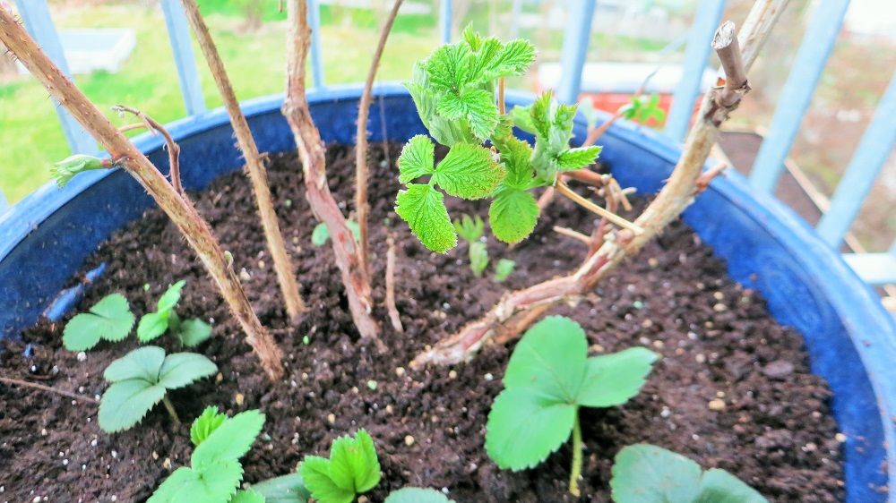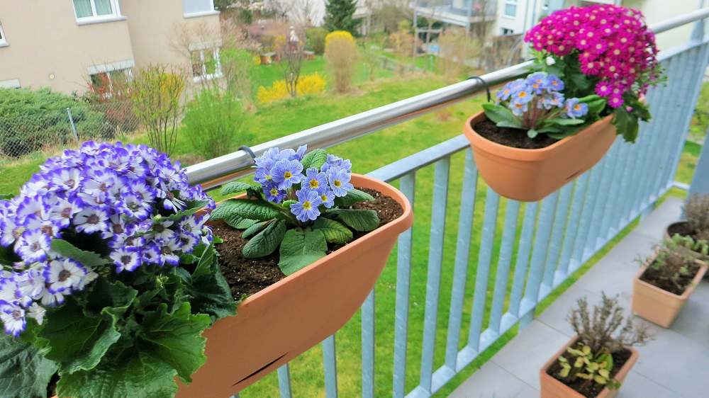 Pendant ce temps, le printemps est aussi arrivé sur mon balcon. Quelques nouveaux venus embellissent les bacs pendus à la barrière, pendant que les framboises, les fraises et les herbes aromatiques – ici mon plant de thym – reprennent gentiment des couleurs appétissantes!