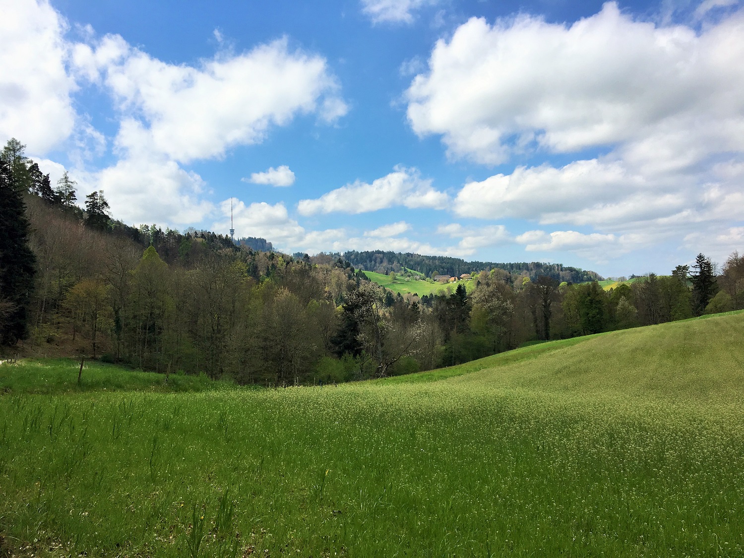 Nous profitons d’une des magnifiques journées de ce mois d’avril pour partir à la découverte de la colline que l’on voit depuis la fenêtre de notre cuisine: le Bantiger. Sur ce monticule qui cumule à 947m se dresse une tour de télévision que l’on voit loin à la ronde. La tour a un passé célèbre: pendant la Coupe du monde de football de 1954, organisée en Suisse, c’est grâce à la tour du Bantiger que les matchs ont été retransmis pour la première fois en direct en Europe.