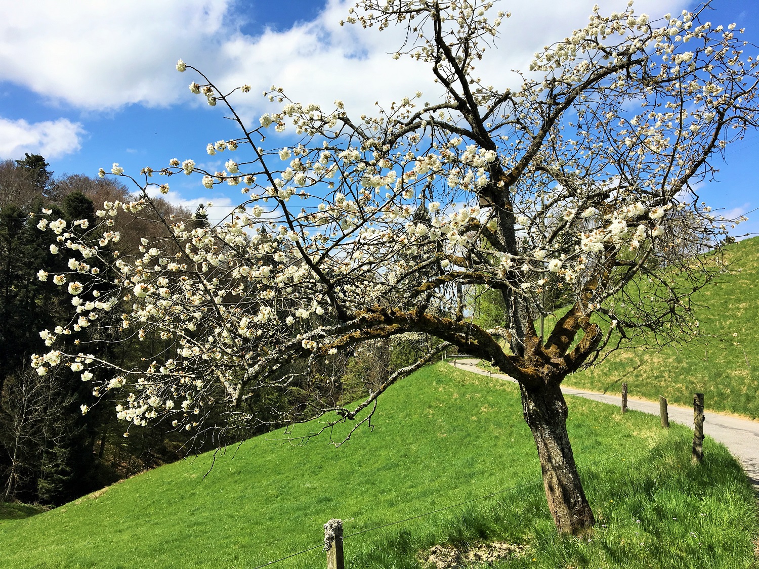 Partout autour de nous, les cerisiers en fleurs célèbrent le printemps. Nous rencontrons deux dames occupées à cueillir des feuilles de pissenlit pour leur salade… Elles nous indiquent le chemin le plus court jusqu’au sommet. La tour semble se rapprocher… Nous sommes sur le Bantigerhubel. Ça y est, plus que 15 minutes jusqu’à la tour!