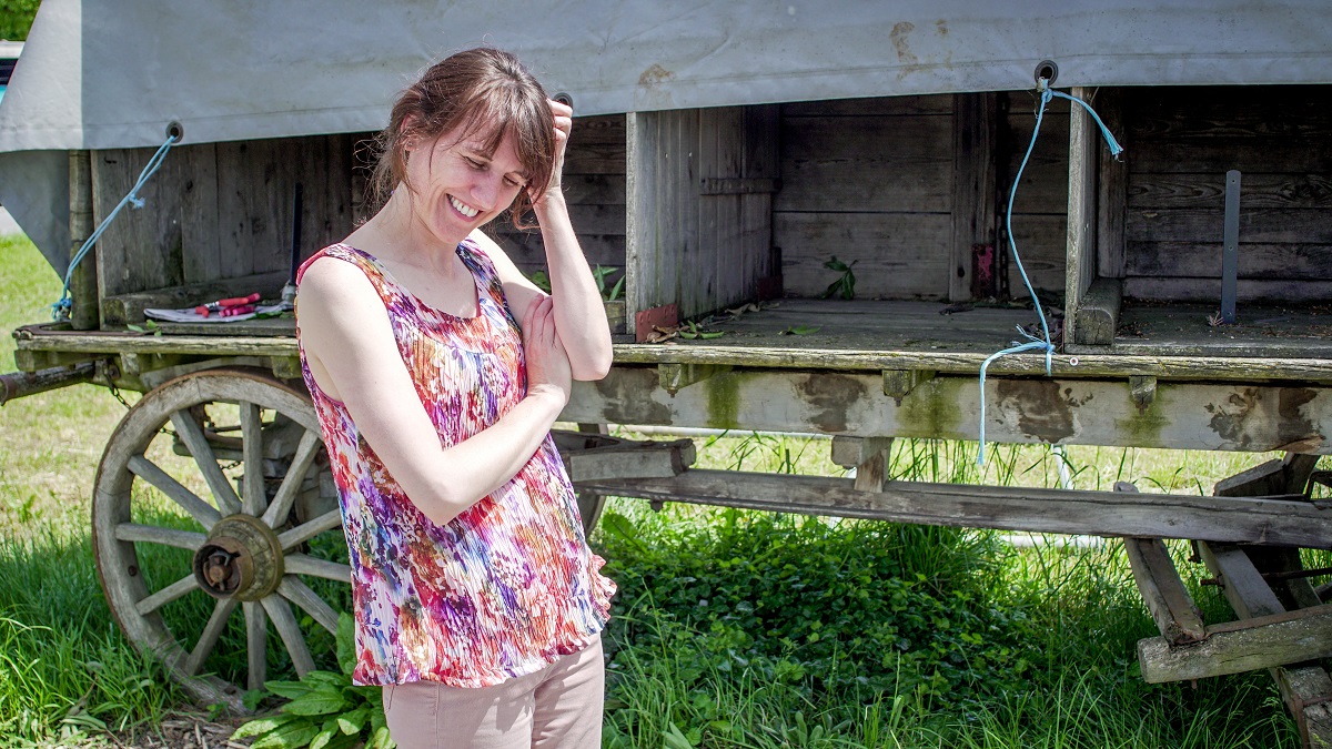 Avec les bouts de tissu récupérés, je suis obligée de choisir un modèle sans manches. J’opte pour une encolure américaine plutôt que des bretelles, je me dis que cela donnera plus de tenue au top. Et afin de simplifier la couture et remédier au côté légèrement transparent du polyester, je choisis un simple voile de coton pour la doublure. Cette dernière me permet de faire des surpiqûres invisibles sur toutes les coutures. Le seul ourlet que je dois réaliser sur le polyester est celui du bas du top: on voit sur les photos qu’il a gondolé un peu, sûrement à cause de mon fer à repasser… J’ai l’espoir que cela ne se verra plus après quelques lavages.