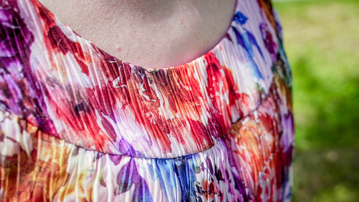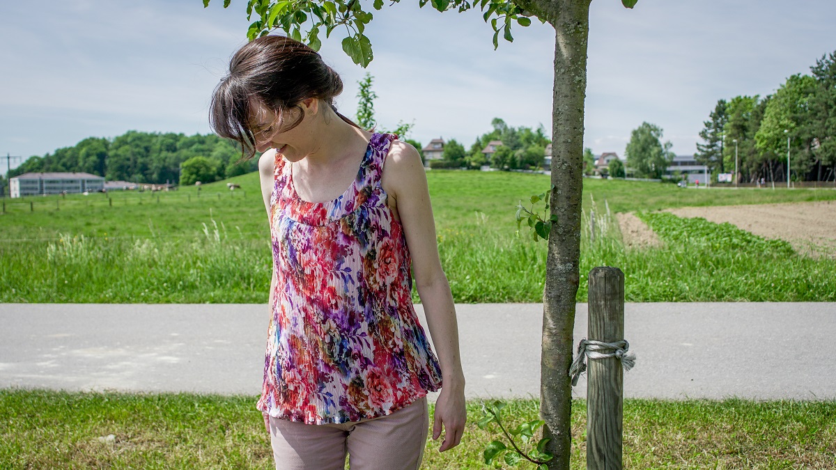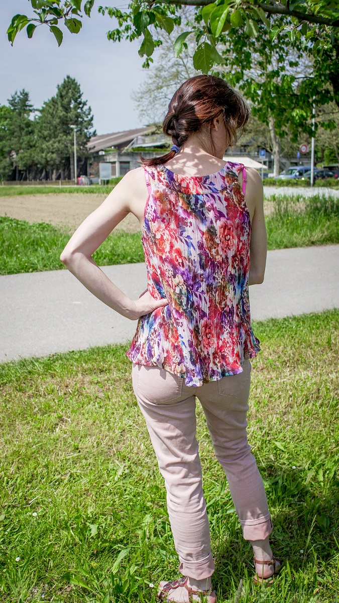 Avec le tissu déjà plissé, j’ai renoncé à faire des fronces à l’encolure, comme c’était prévu sur le modèle de Fait Main (j’en ai fait sur la doublure par contre). Cela m’a permis de découper des pièces moins larges, un détail très utile quand on n’a que des bouts de tissu épars à disposition. Par contre, j’ai dû tricher sur le bas du top et ajouter 2 godets en triangles pour récupérer de l’ampleur. Grâce au motif fleuri et aux plis du tissu, cela ne se voit absolument pas!