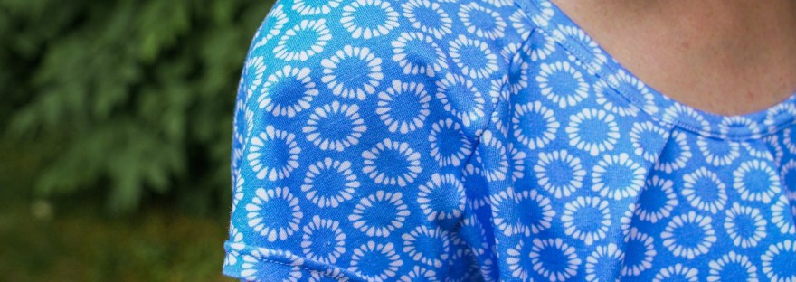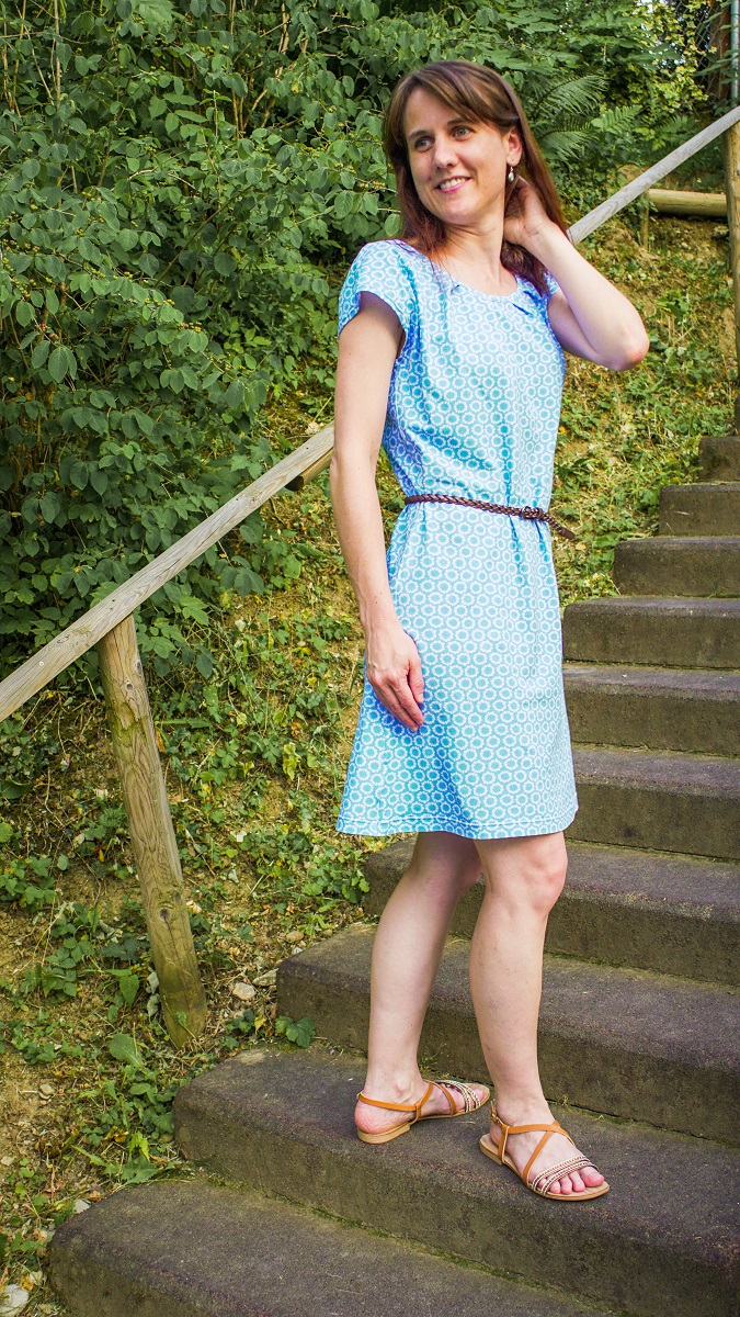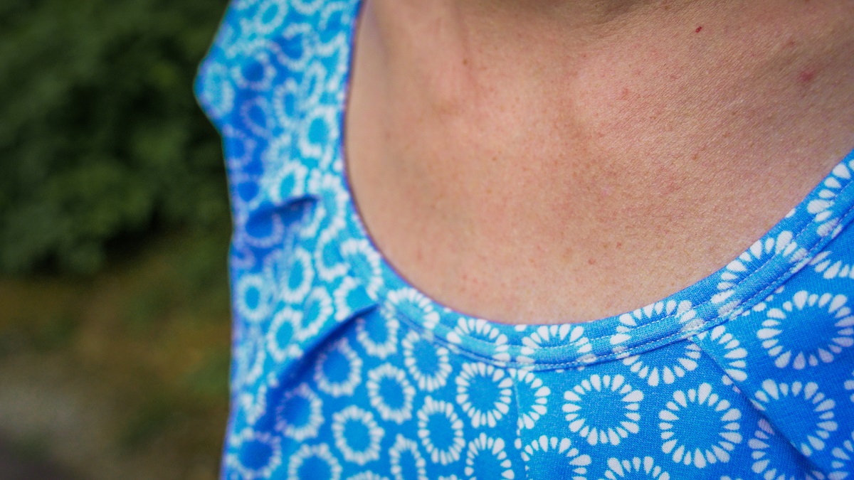 Mais bon, quand la chaleur et la motivation le permettent, mon occupation préférée reste évidemment ma machine à coudre. En projet: deux robes estivales avec des tissus de ma réserve de longue date. Je vous présente la première: une coquette robe en jersey bleu ciel avec des motifs géométriques blancs. Un petit jeu de plis original décore l’encolure.