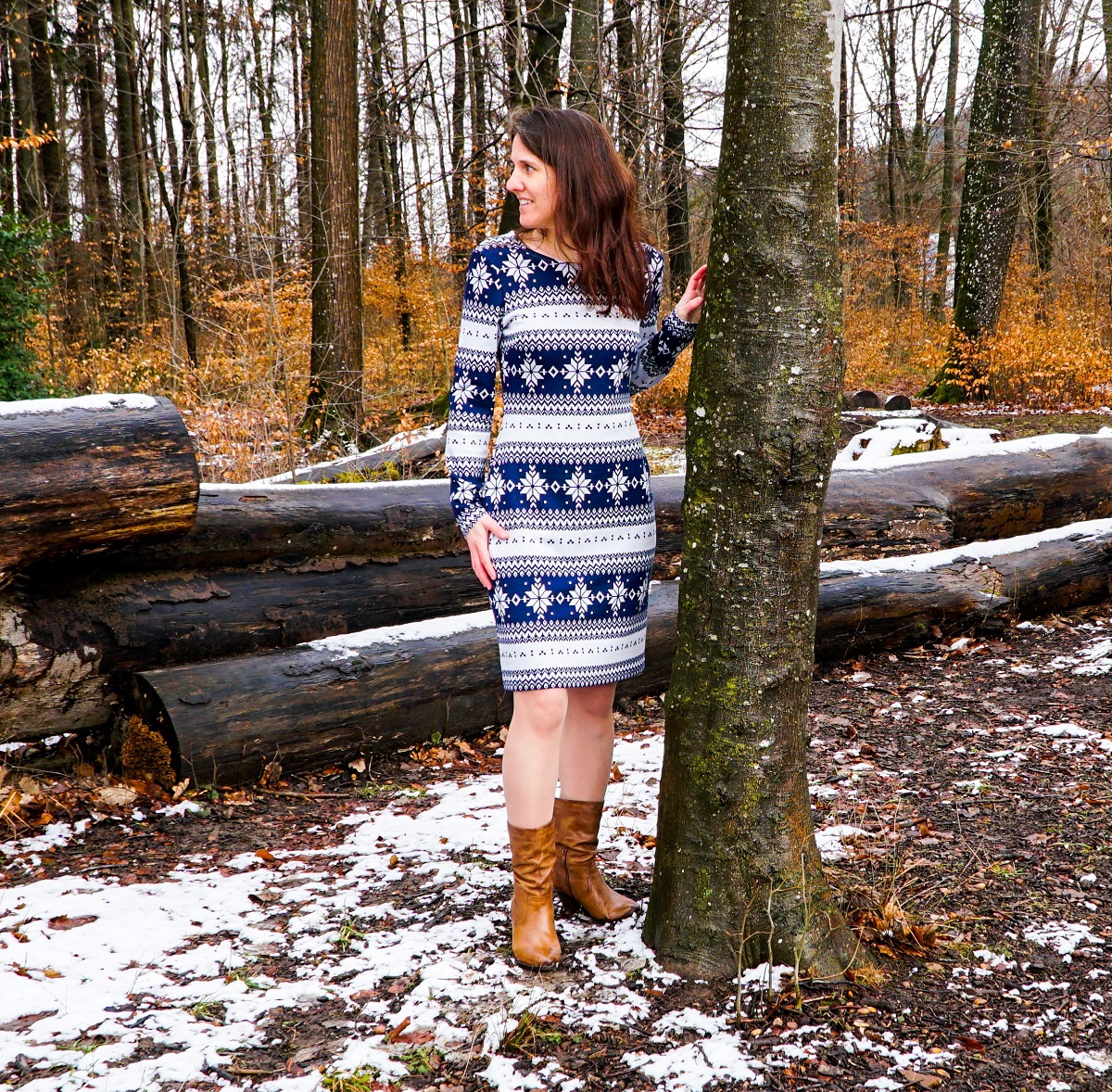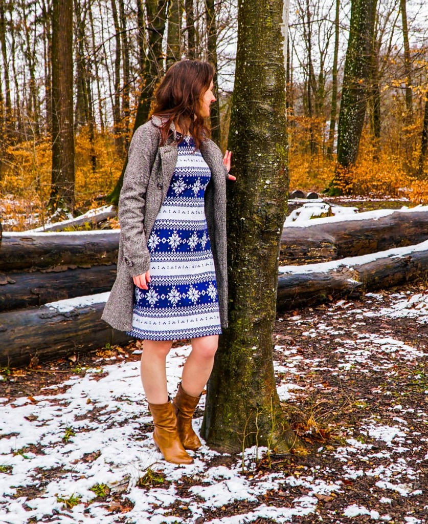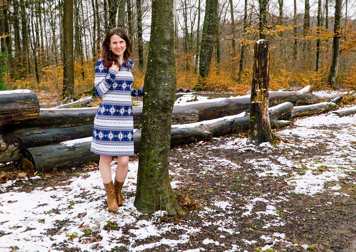 Voilà bien longtemps qu’un tissu en jersey bleu et blanc à motif norvégien attendait dans les réserves de mon atelier. J’ai toujours eu envie de le transformer en robe, mais je ne trouvais ni le temps ni le patron adéquat pour me lancer. Cet hiver, entre deux représentations au Pôle Nord, j’extirpe une énième fois le tissu à flocons de sa boîte. Et je me lance.