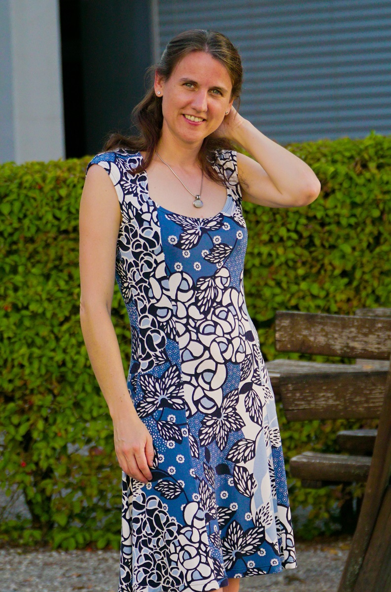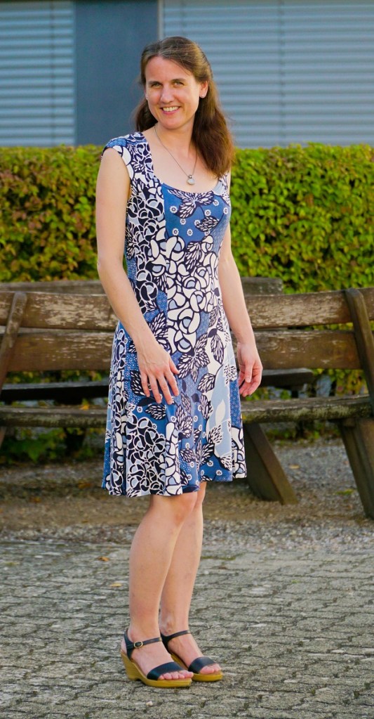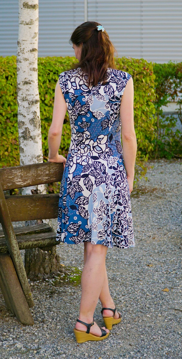 On n’a jamais assez de robes estivales dans l’armoire. Surtout quand elles sont légères, fleuries, virevoltantes et en jersey de viscose. Comme la robe de la page de couverture du Fashion Style 08/2016 (modèle 9): avec sa jupe dansante, ses manches papillon et son encolure généreuse, elle fait partie de ces modèles qui retiennent immédiatement l’attention. Juste le modèle qu’il me fallait pour mettre en valeur un coupon de 1m50 de jersey viscose à fleurs bleues et blanches.