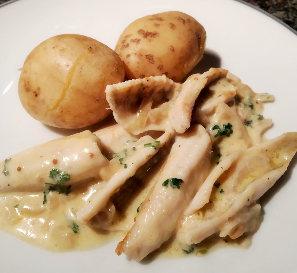 Servir avec des pommes de terre en robe des champs ou un autre féculent à votre goût.