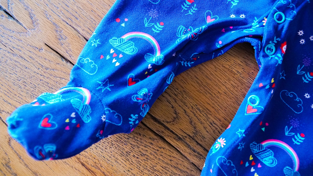 Un détail que j’aime bien dans ce modèle: les mignons petits pieds qui permettent de garder les petons bien au chaud. Ils sont bien plus faciles à coudre qu’ils n’en ont l’air. L’encolure est terminée avec une simple parementure. Enfin, l’ensemble de la grenouillère est boutonnée de haut en bas avec des pressions bleu turquoise.