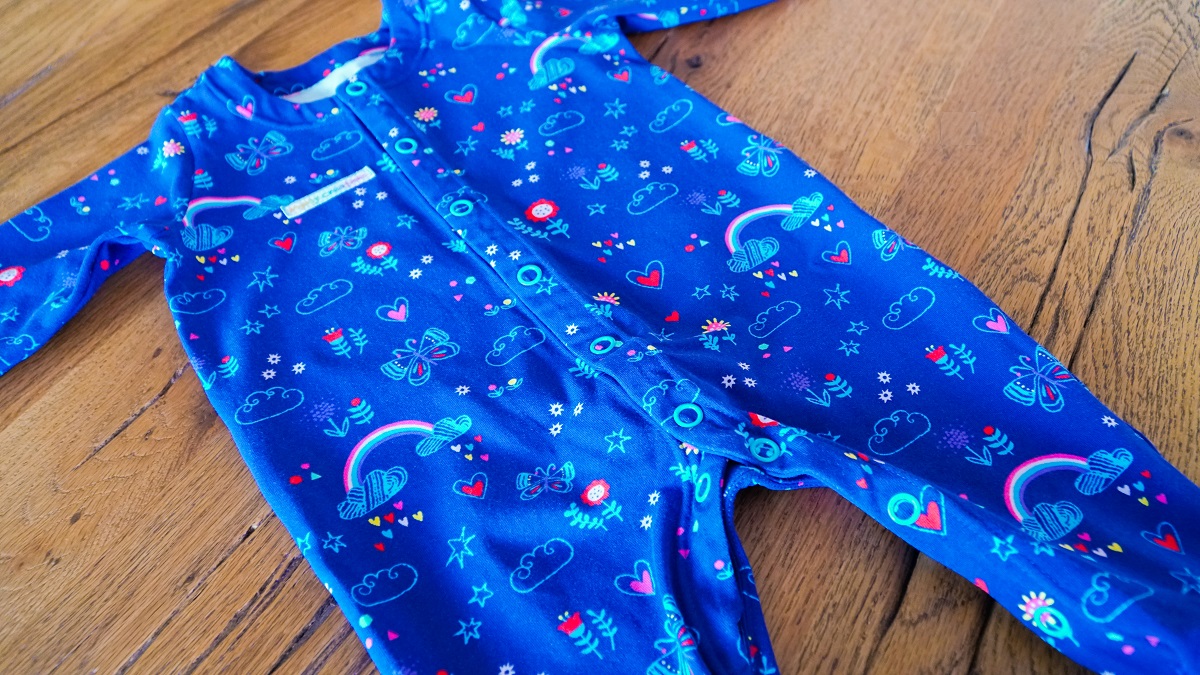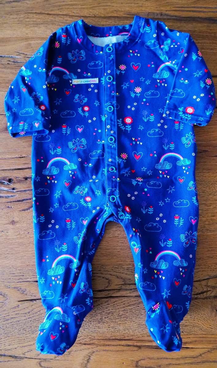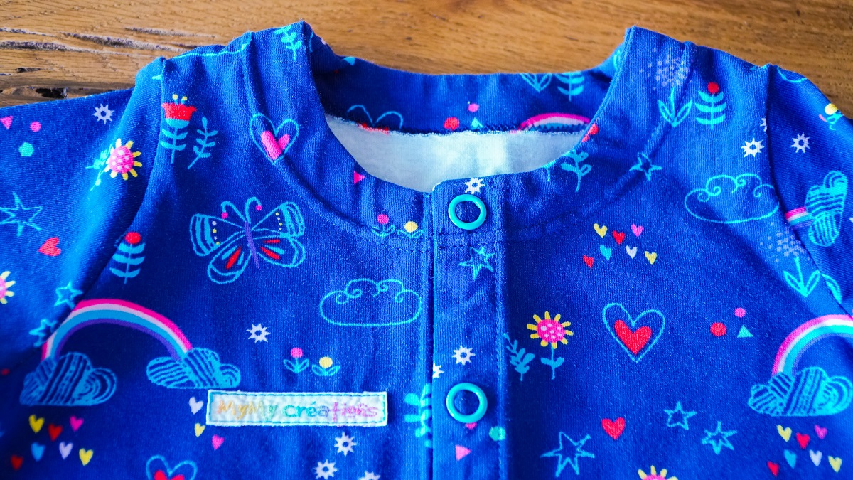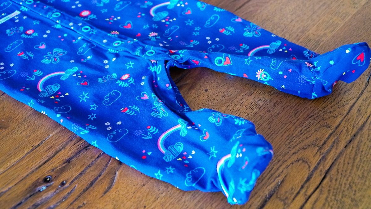 La fin de l’année approche, et avec elle arrive l’heure des bilans couture. Après une année 2018 très productive avec un total de 8 créations pour bébés, le millésime 2019 s’avère nettement plus modeste: j’aurai recouru en tout et pour tout 4 fois à ma machine à coudre pour réaliser des cadeaux de naissance en 2019 – dont une fois pour des jumeaux, nota bene. La dernière création en date est une grenouillère tout en bleu pour le deuxième bébé d’un couple d’amis, né à la fin de l’été.
