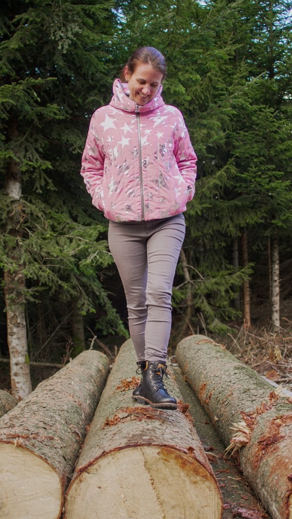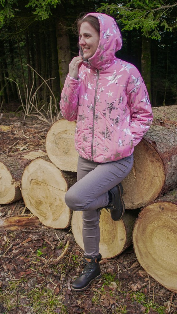 Le modèle vient du magazine Burda Style de décembre 2019 (n°112b). Cela faisait longtemps que je cherchais un modèle court pour mettre en valeur le coupon de tissu matelassé rose que j’avais acheté aux soldes il y a quelques années. Comme il ne restait qu’à peine 1m50, je ne pouvais pas rêver de réaliser un modèle complexe. La veste courte avec sa capuche, son zip devant et ses poches prises dans les coutures, était le modèle parfait.