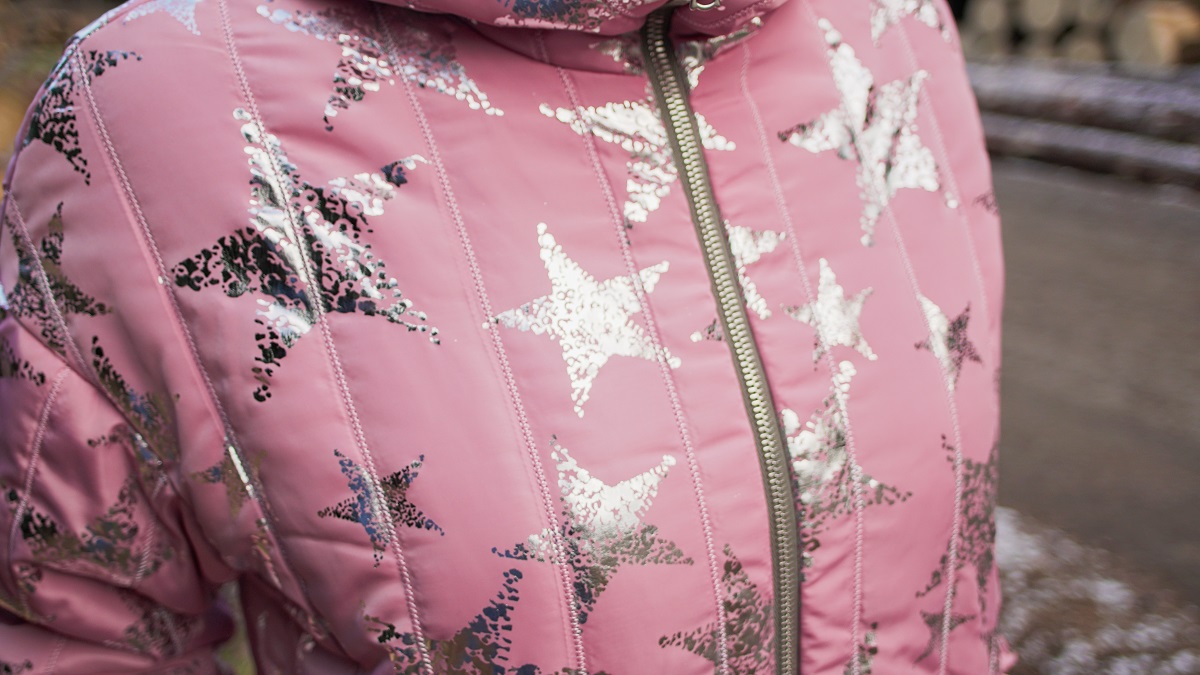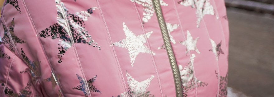 Après avoir cousu les manches dans les emmanchures (aucune complication), me voici confrontée au dernier petit défi de la veste: la pose de la fermeture éclair sur les devants. Je choisis un joli zip en métal argenté pour rappeler la couleur des étoiles sur la veste. Il ne faut pas oublier de s’assurer que les coutures de la capuche sont bien alignées à droite et à gauche du zip, sans quoi le rendu ne sera pas beau une fois la veste fermée. Et coudre évidemment le plus près possible du zip, avec un pied spécial pour fermetures éclairs.