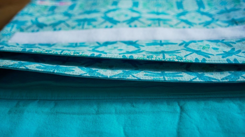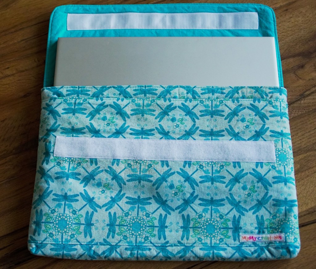 Pour réaliser la pochette, j’ai d’abord pris les mesures de mon ordinateur, en prenant soin d’ajouter suffisamment de marge pour les côtés. Toutes les pièces de la pochette sont doublées d’une vlieseline thermocollante qui donne du volume. Une poche est aménagée sur le devant afin d’y ranger le câble d’alimentation électrique.