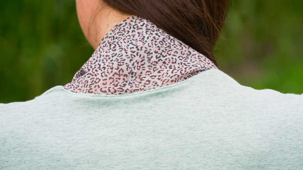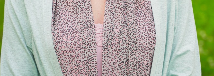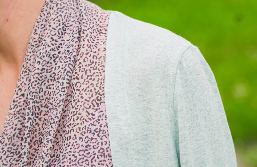 Le jersey vert menthe était dans ma réserve depuis longtemps. J’avais prévu d’utiliser un voile de polyester dans le même ton vert pour la doublure: malheureusement, il s’est avéré que ce tissu arborait une tache indélébile, vraiment peu esthétique, en plein milieu de la pièce que je devais découper. A la recherche d’une alternative, j’ai déniché ce coupon de viscose quasi transparente avec son motif animalier noir et rose. Il se marie à merveille avec la couleur menthe du jersey. En plus, la viscose a l’avantage de ne pas être aussi électrique que le voile de polyester.