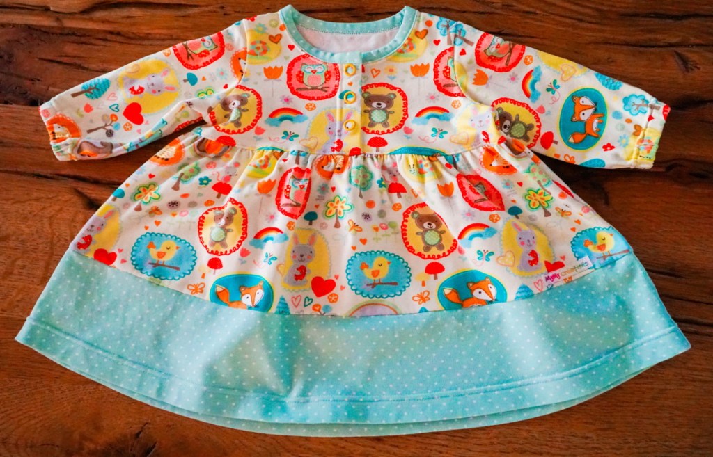 Avec ses deux jerseys assortis et sa forme ample froncée, cette robe est une de mes créations bébé les plus réussies. La petite fille qui en a été l’heureux bénéficiaire s’y est certainement sentie très confortable. Et même si je sais que les robes ne sont pas les vêtements les plus pratiques quand les petites commencent à marcher à quatre pattes… cela ne m’empêchera pas de continuer à coudre avec bonheur de petites robes miniatures!