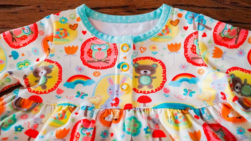 Le modèle 4 du magazine Ottobre 6/2016 est une ravissante robe bicolore en jersey. Le haut se ferme sur une simple parementure boutonnée au milieu devant. J’ai mis à profit mes boutons pression favoris, achetés en ligne (référence ici), de couleur jaune assortie au motif du tissu. Les deux jersey de coton viennent de ma réserve. Le biais d’encolure est réalisé dans le même jersey que le bas de la robe: j’adore le contraste du motif enfantin avec le tissu turquoise à pois.