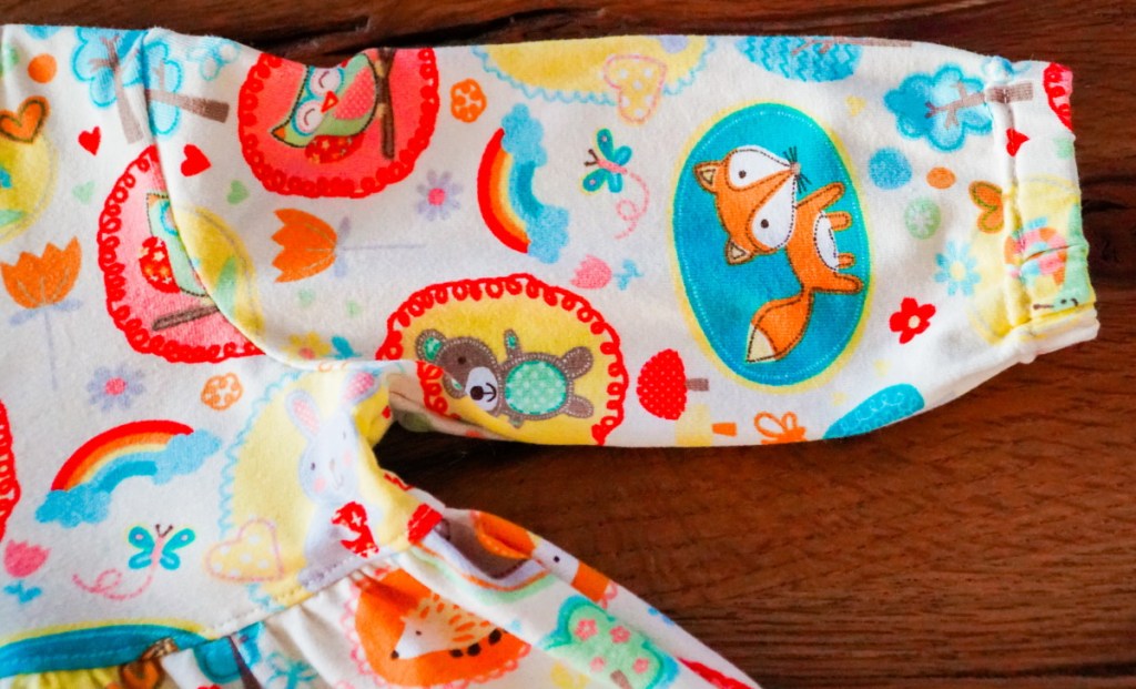 La jupe ample est froncée sur le dos et le devant. Je passe des heures à répartir harmonieusement les fronces, comme d’habitude…Mais le résultat est vraiment trop mignon. Les manches longues se terminent sur un bracelet fin dans lequel est introduit un élastique pour froncer les poignets. La manipulation pour fermer le bracelet est un peu délicate avec l’aiguille double – il faut tirer sur le poignet en même temps que l’aiguille double avance, c’est un peu périlleux… Mais là aussi je suis très contente du résultat.