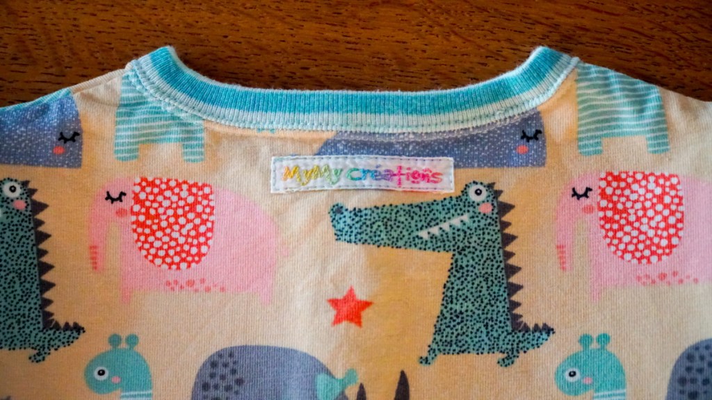 Le bénéficiaire du cadeau de naissance est le quatrième enfant d’une collègue de travail. J’avais déjà réalisé un cadeau de naissance pour son petit frère, né en septembre 2018 (à relire dans ce post). Comme la dernière fois, je décide d’utiliser deux tissus différents pour donner plus de contraste au vêtement. Je combine donc le jersey aux animaux avec un bord côtes à rayures bleues et turquoises pour l’encolure, la patte polo, les poignets et les chevilles.