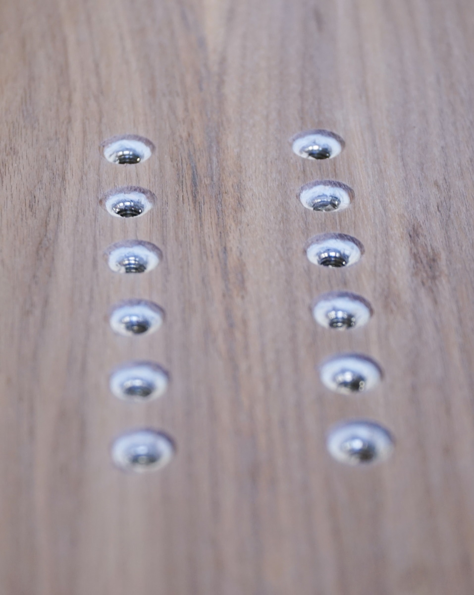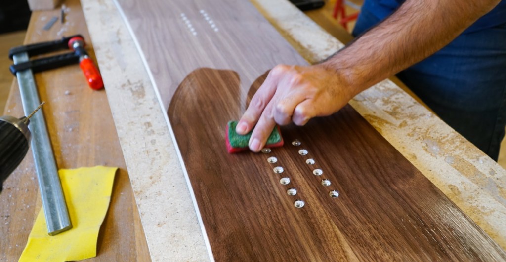 Une fois le board découpé, la suite des opérations consiste surtout à poncer, poncer et reponcer. Avec un doigt lésé et de la main gauche, cela s’avère un peu plus compliqué que prévu… Ce sont surtout les courbes qu’il faut bien poncer pour les rendre régulières. Pour terminer les côtés et bien dégager les carres, on termine le ponçage des bords à la machine. Enfin, les trous des inserts, marqués sur les côtés du board avant la mise sous presse, sont réalisés à la perceuse.