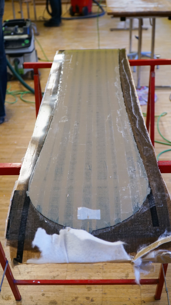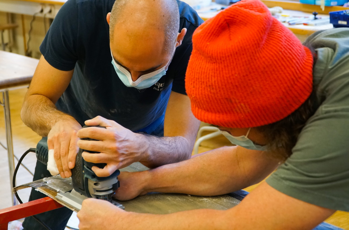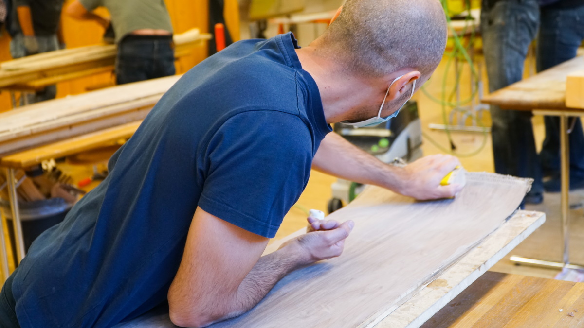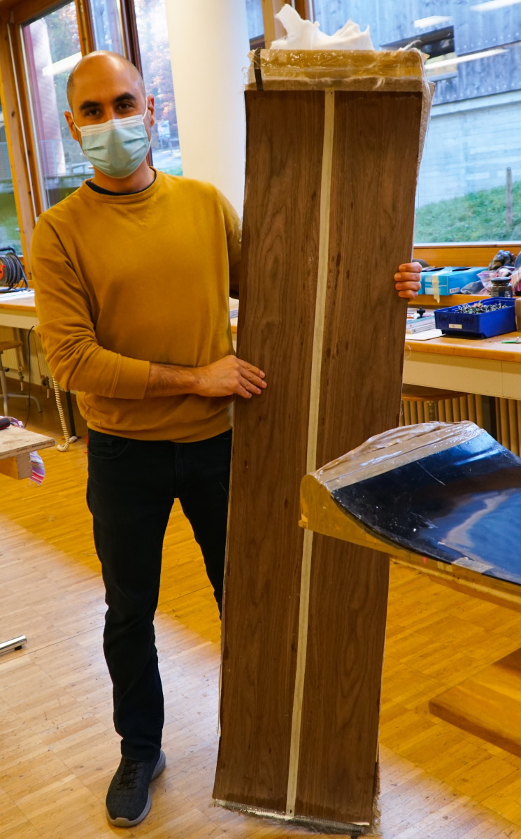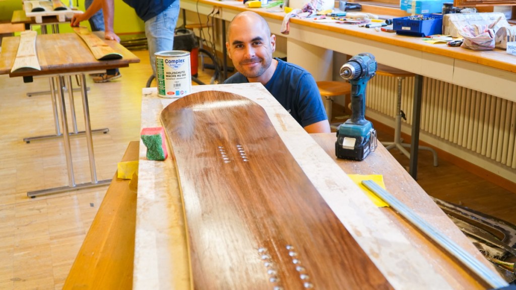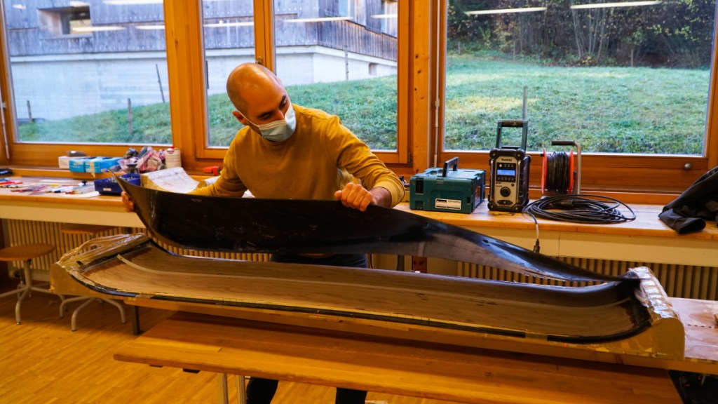 Après une bonne nuit de sommeil, il est temps de retourner au centre de cours d’artisanat de Ballenberg pour découvrir le résultat du travail réalisé par Héctor le jour antérieur. Pressé toute une nuit sous vide dans son sac en plastique, le savant assemblage de bois, de plastique, de fibres et d’epoxy devrait donner naissance à un vrai snowboard. Sera-t-il réussi?