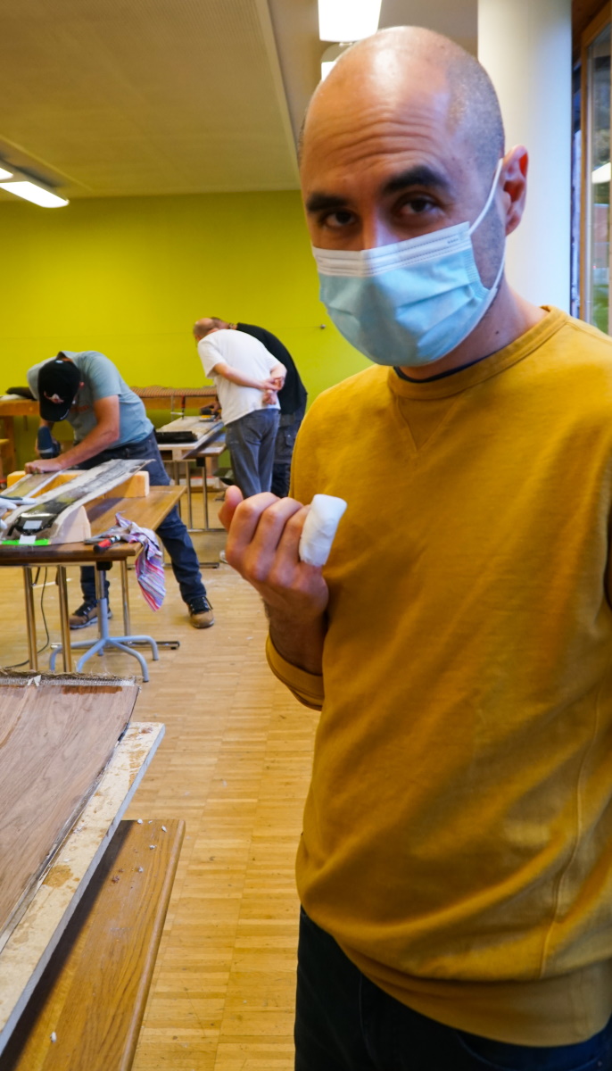 Le suspens est insoutenable pendant que le gros bloc d’epoxy glisse de son sac. Les couches semblent bien collées entre elles, nul doute, mais mise à part cette bonne nouvelle il faut bien avouer que le grand rectangle qui sort du sac ne ressemble pas encore à un snowboard… C’est logique, car il faudra d’abord scier dans le bloc pour découper la vraie forme du snowboard. Mais avant cela, Héctor s’attaque au nettoyage de la surface et au grattage des bouts d’epoxy collés au bois. Il s’aide d’une lame de rasoir et… aïe!!! … le voilà qui signe sa création d’un filet de sang venu tout droit de son petit doigt. Heureusement, la coupure n’est pas profonde et la boîte des premiers secours est à portée de main.