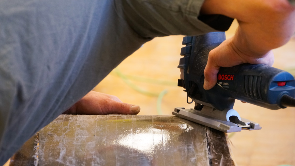 Après avoir poncé le dessus pour enlever les imperfections du bain d’epoxy, le board est retourné à l’envers sur deux chevalets. Les contours du snowboard, le dessous étant protégé par une couche de scotch brun, sont bien visibles. Héctor les suit soigneusement avec une scie sauteuse, de manière à découper la forme du board en évitant de scier dans les carres en métal. L’odeur de la fibre de verre brûlée est ravissante… (heureusement qu’on porte des masques…).