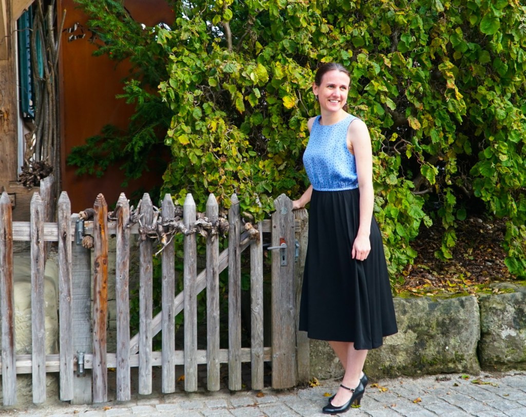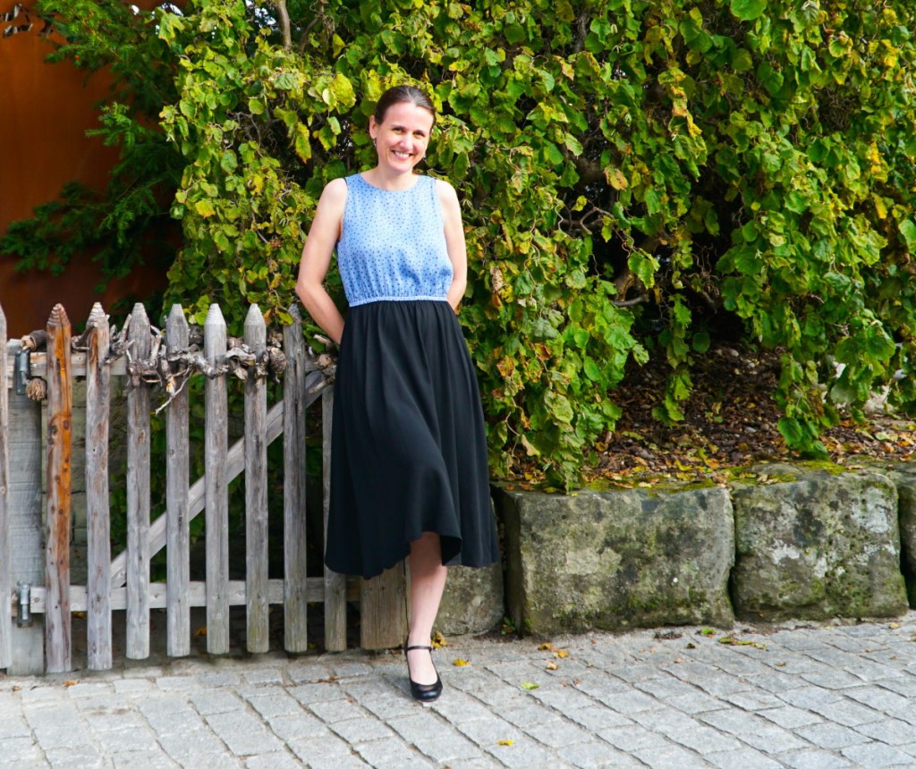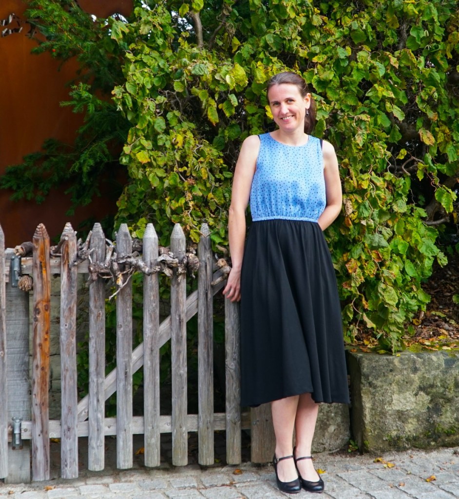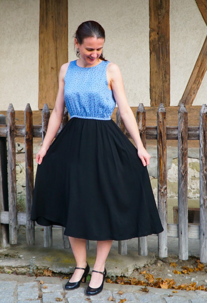 Le patron vient du magazine Burda 4/2020 (modèle 101). Il a tout de suite retenu mon attention: buste menu, taille haute élastiquée, sans manches, jupe ample, longueur élégante. Avant de le réaliser dans plusieurs tissus de ma réserve, je décide de faire un premier essai avec une chute de viscose satinée bleue à pois noirs combinée avec une viscose noire fluide pour la jupe. Un pari réussi.
