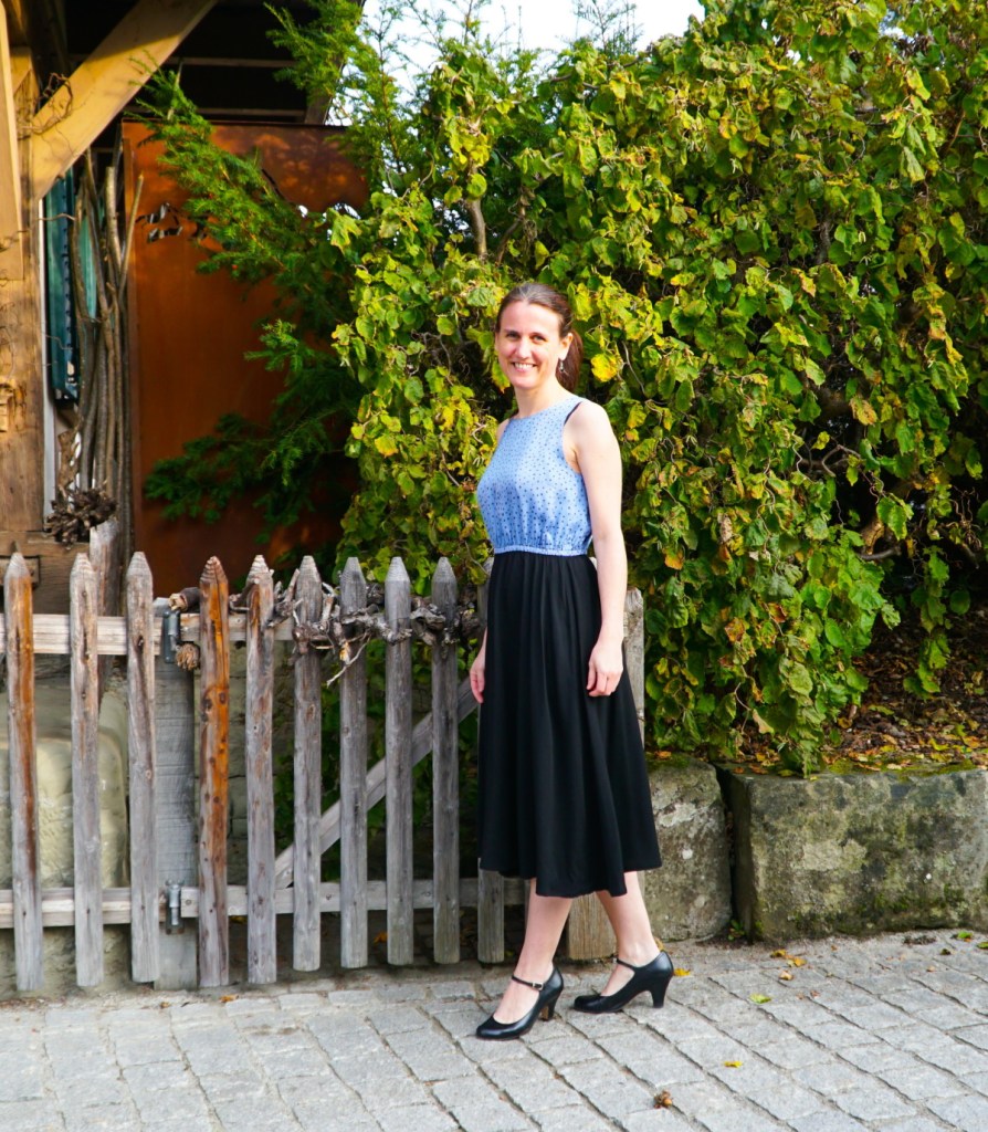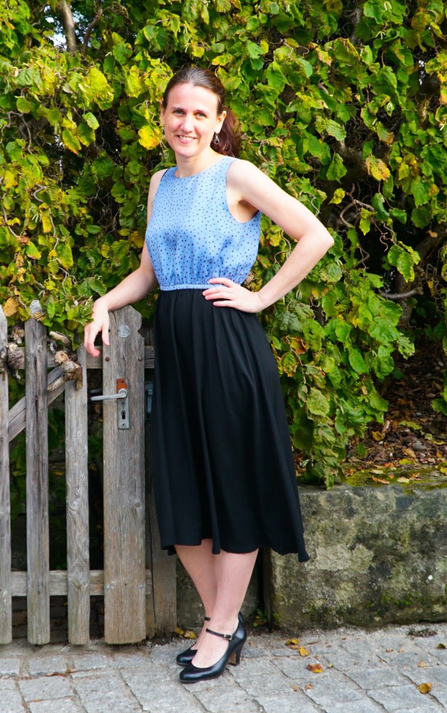 Avant de passer aux modèles hivernaux en accord avec les premières neiges qui viennent de tomber, j’ai encore une dernière robe d’été à vous présenter. Un modèle élégant en bleu et noir, deux couleurs que j’aime beaucoup combiner.