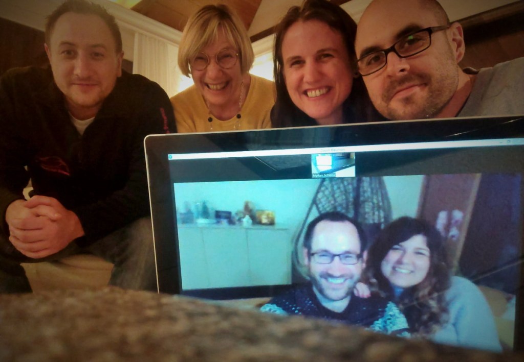 Marc et Faby nous rejoignent pour une vidéoconférence par Zoom après le partage du gâteau. Nous piquons quelques fous rires pendant nos tentatives d’abord infructueuses de nous prendre en selfie les six… On finit par y arriver grâce au déclencheur automatique du portable de René appuyé contre la cheminée. Au moins, le Covid nous rend inventifs!