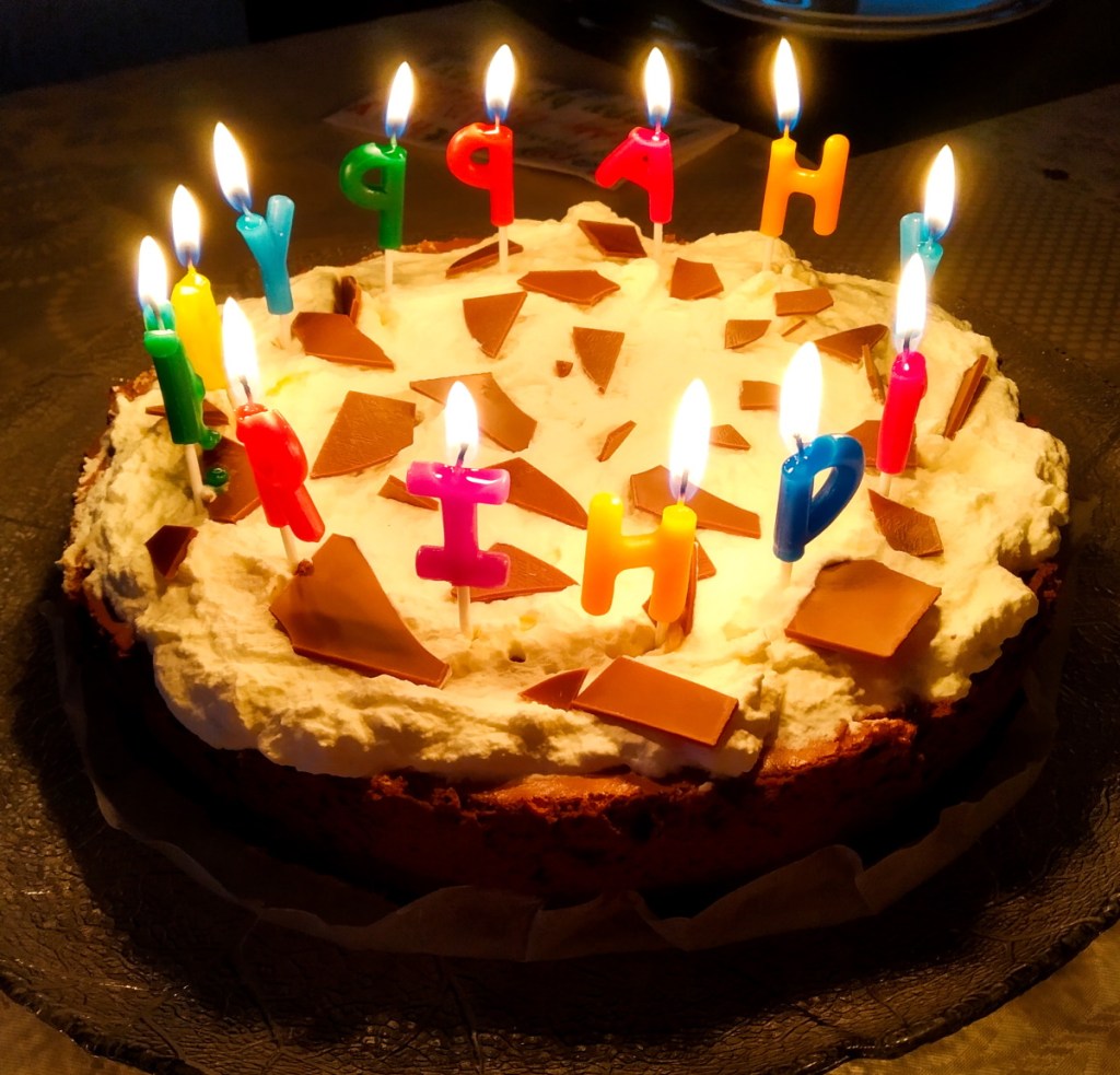Le dessert nous prend un peu au dépourvu car nous avons beau feuilleter les nombreux manuels de l’Office fédéral de la santé publique, nous ne trouvons pas de consignes concernant le soufflage des bougies d’anniversaire… Nous décidons finalement de prendre ce risque (au cas où, j’ai pas soufflé trop fort, et personne ne s’est mis en face…).