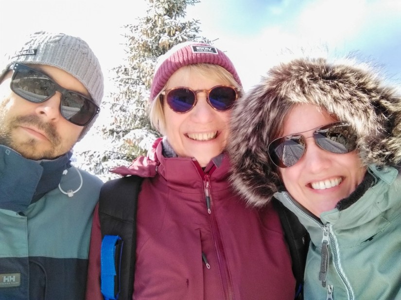 Les inconvénients du ski masqué: tu as les oreilles en feu après quelques descentes à cause des élastiques qui tirent; tu développes un tic à force de remonter et redescendre ton masque; tu dois crier pour te faire comprendre des autres personnes sur la piste; au bout d’une heure à peine, ton masque est tout mouillé de condensation à l’intérieur (puark…); s’il fait très froid tu développes probablement des glaçons sous le masque (on n’a pas encore testé, il faisait trop chaud ce jour-là).