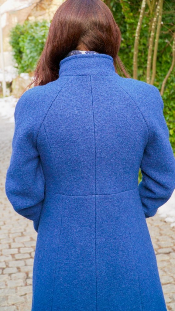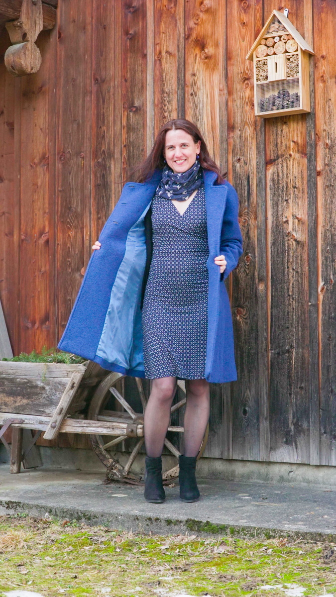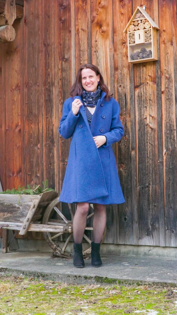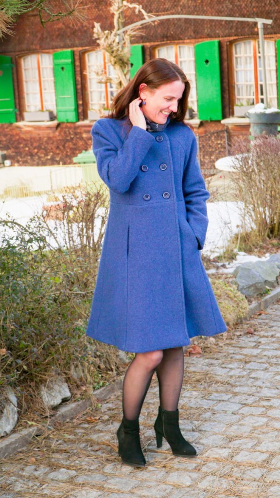 Je suis vraiment très fière de mon premier manteau en laine entièrement doublé. Il est élégant, il tient chaud et il me va parfaitement bien. J’aime beaucoup le devant croisé et les poches dans les coutures. La longueur est idéale pour le porter sur une petite robe en jersey. D’ailleurs, le jour du photo-shooting près de chez moi, il faisait un véritable froid de canard, si bien que j’ai un peu regretté le choix de porter une robe et des bas en nylon… Mais du coup je peux confirmer que la laine feutrée, ça tient quand même bon chaud!