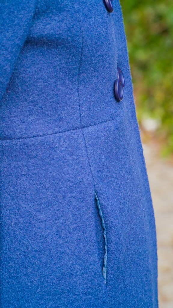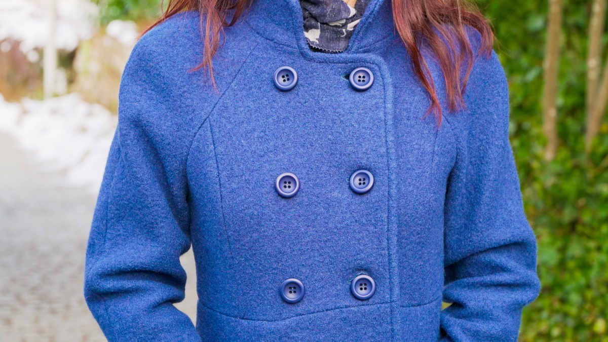 J’en suis là lorsque le confinement du printemps 2020 se termine. N’ayant plus l’occasion de porter le manteau – la saison froide est passée – il restera un bon moment inachevé dans mon armoire. Je le ressors au début de la deuxième vague de Covid en automne. Il ne reste à faire que les trois grandes boutonnières sur le devant et à coudre les boutons. Je les choisis bleus et de forme neutre (2,5 cm de diamètre). Trois boutons servent à fermer le manteau, les trois autres ne sont que décoratifs.