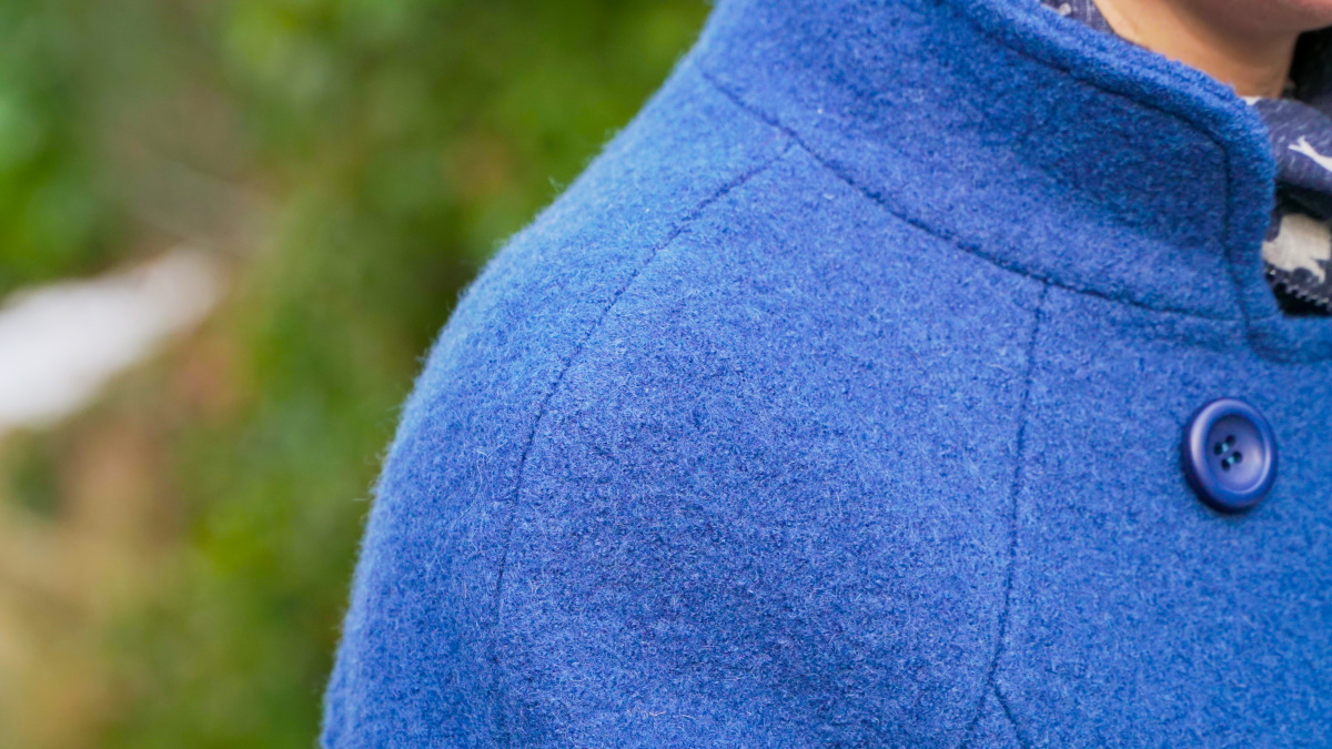 Le reste de l’assemblage du devant et du dos ne présente aucune difficulté, si ce n’est qu’il faut veiller à ce que les pièces soient bien ajustées entre elles. Les manches raglan sont formées de deux pièces, formant une courbe harmonieuse sur l’épaule. Elles sont suffisamment larges pour pouvoir porter un gros pull sous le manteau. Le petit col n’est pas vraiment compliqué à coudre non plus.