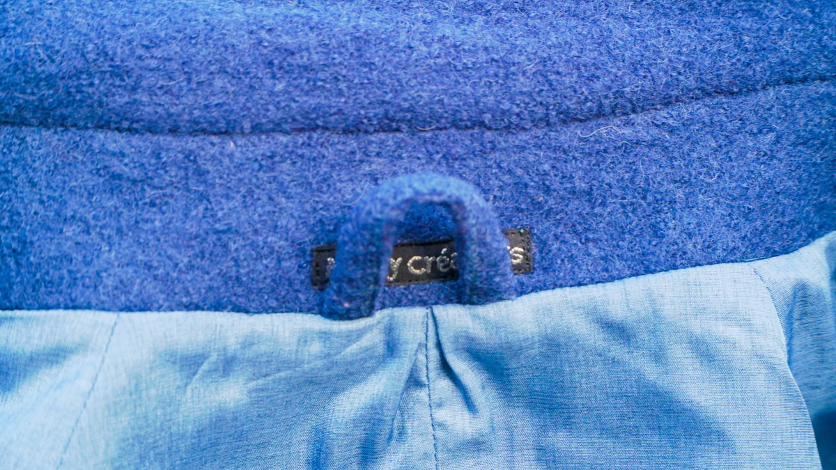 Une fois le dessus cousu, je m’attelle à l’assemblage de la doublure. Il faut la prévoir moins longue sur le bas du manteau et le bas des manches. Une parementure en lainage s’ajoute sur le devant et le col. Je laisse une petite ouverture sur une des coutures de côté de la doublure, pour pouvoir retourner aisément le manteau. Juste sous la parementure du col, je couds une bride qui me permettra de suspendre le manteau à un crochet. Comme vous le voyez sur la photo ci-dessous, la doublure comporte un pli d’aisance de 2cm au milieu dos.