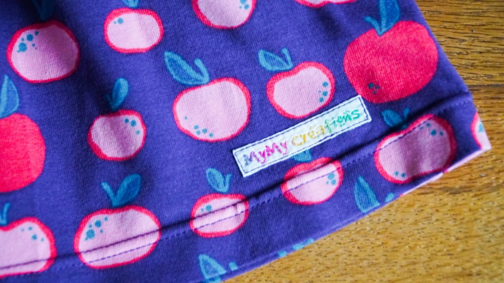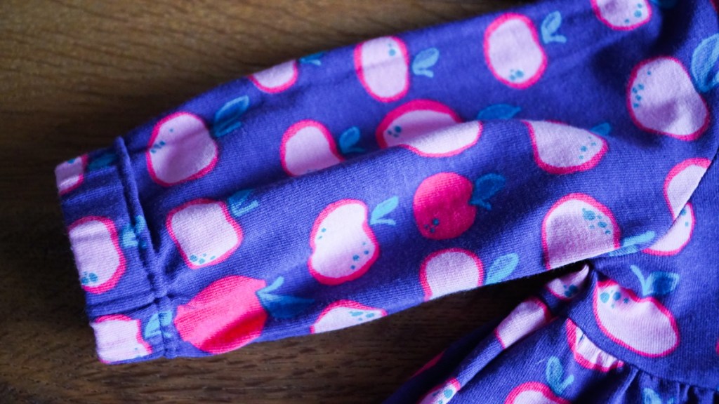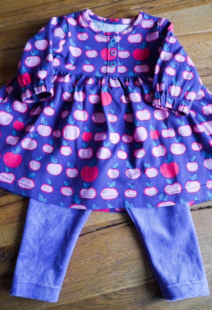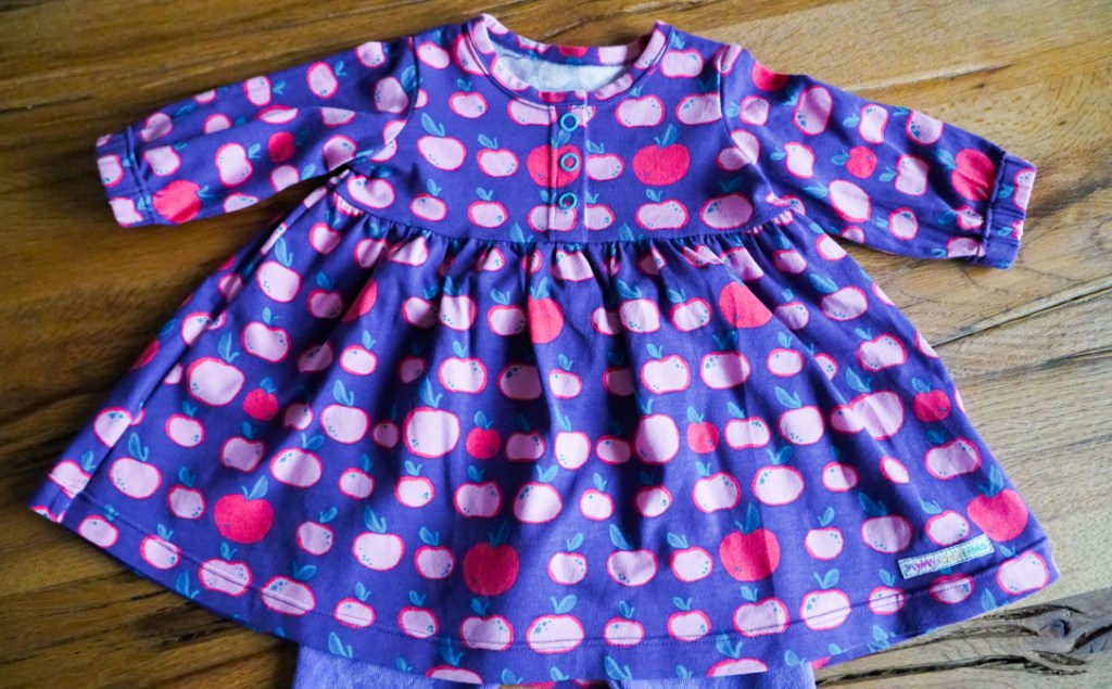 Ma première création pour bébé de 2021 est en fait la dernière de 2020. Je l’ai réalisée pour une petite Emilie née juste avant Noël, le deuxième enfant d’un couple d’amis de Suisse romande. Une fille… yes! encore une occasion de coudre une robe! J’en profite même pour sortir de ma réserve un tissu coup de coeur que je rêvais depuis longtemps de transformer en petite robe trop mignonne. J’adore ce jersey violet au motif de pommes roses super cute.
