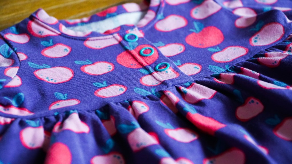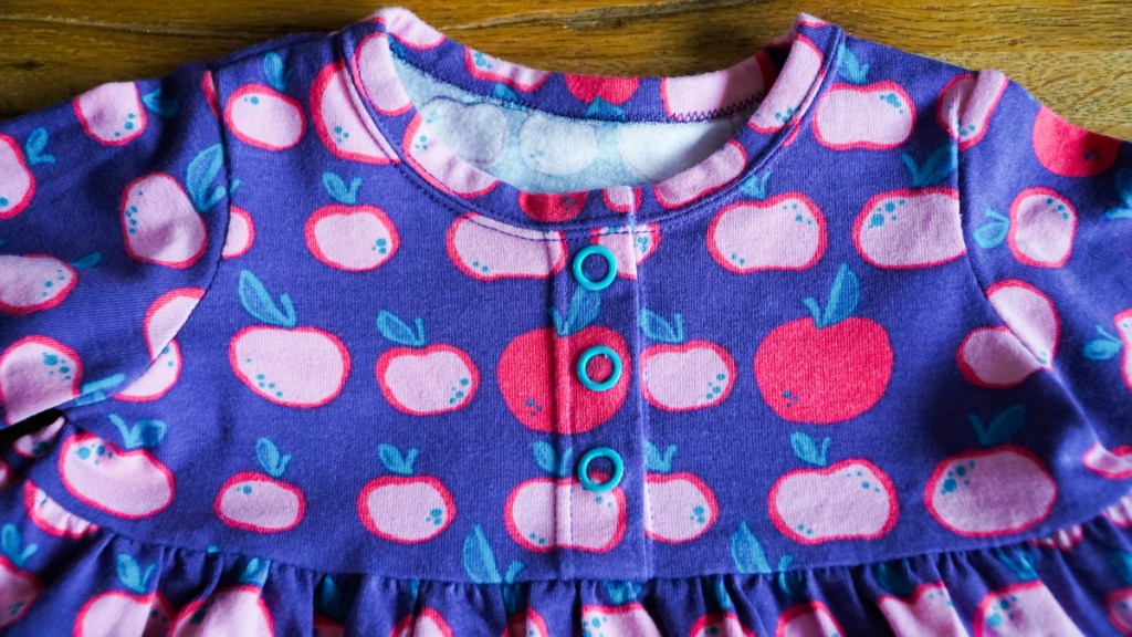 L’encolure de la robe est terminée avec un biais et une surpiqûre à l’aiguille double. La patte polo très simple sur le devant est fermée avec trois boutons pression. Je les ai choisis de couleur turquoise: j’adore le contraste avec le fond violet et le rose des pommes.
