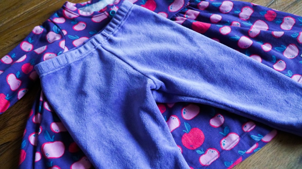 Dans ma réserve de tissus, je trouve un petit reste de velours violet parfaitement assorti au tissu de la robe, et juste assez grand pour réaliser de petits leggings confortables. Le modèle vient aussi de Ottobre, très exactement du magazine 1/2017 (modèle 3, « Baggy »). Ils sont extrêmement simples à coudre et comportent un élastique à la taille. L’ensemble formé par la robe et les leggings assortis est trop mignon. J’espère que Emilie s’y sentira à l’aise!